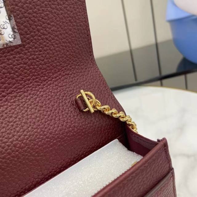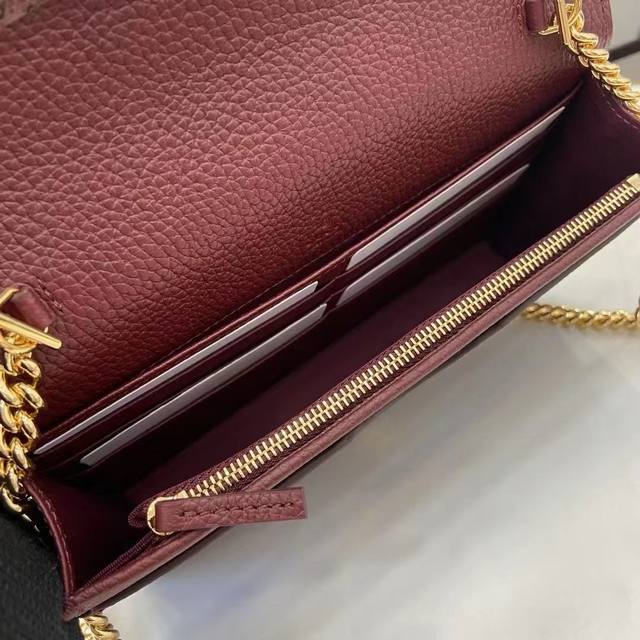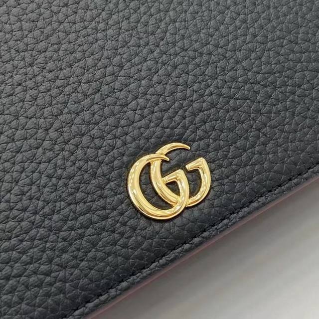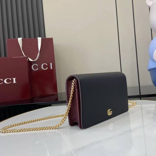 A top-of-the-line new arrival, this Gg Marmont wallet-on-chain features a contrasting interior for a striking new twist. Embellished with the signature Double G hardware, it features a detachable chain shoulder strap, creating a versatile style perfect for day or night. While compact, it offers uncompromising practicality, with a well-organized interior for cards and other essentials. Black and Gucci Ankora leather. Gold-tone hardware. Gucci Ankora taffeta lining. Double G. Interior: 6 card slots, 1 flat pocket, 1 gusseted zip pocket, and 1 open compartment. Mirror. Detachable chain shoulder strap with a 60cm drop. Snap-button closure. Weight: Approximately 0.40 kg. Model No. 497985. Dimensions: 20cm wide x 12.5cm high x 4cm deep. Color: Black and Ankora.