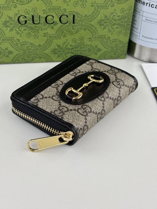 Gucci introduces its new 1955 Horsebit cardholder, crafted from Gg Supreme premium canvas and black leather. This design features the signature double-ring and elongated shape, a detail inspired by the brand's equestrian heritage and one of Gucci's most iconic symbols. Style Number: 658549 Dimensions: 11.5cm x 8.5cm x 3cm Color: Black