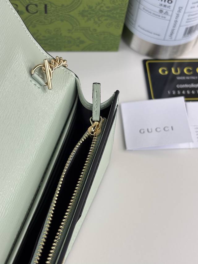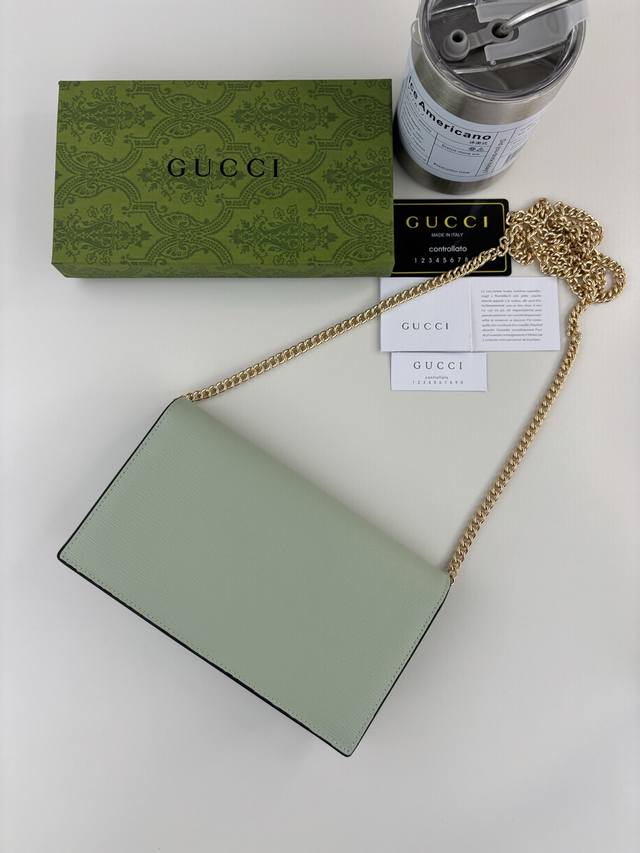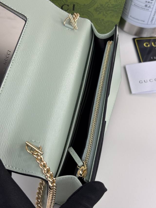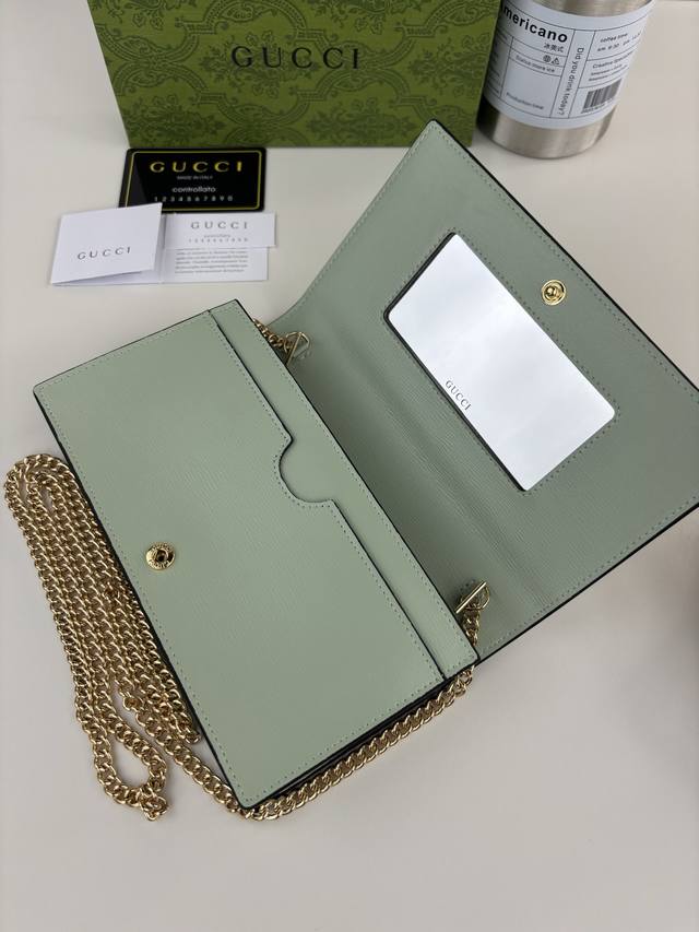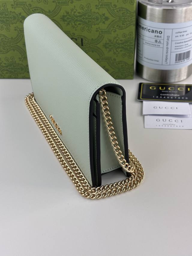 Guccl Chain wallet with handwritten Gucci logo. The small leather accessories collection seamlessly blends modern fashion elements, creating timeless pieces that are timeless and bring a fresh touch to formal leather pieces. This chain wallet is expertly crafted from green leather and cleverly detailed with the handwritten Gucci logo in gold. Green leather, gold-tone hardware, taffeta lining, handwritten Gucci logo details. Interior: six card slots, one flat pocket, one gusseted zip pocket, one open compartment, chain strap, and snap closure.