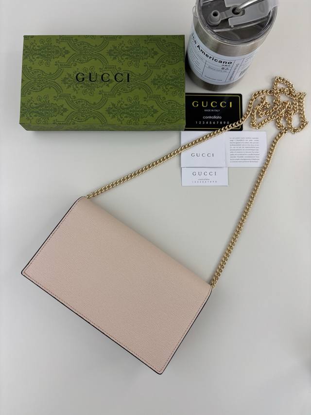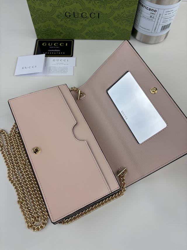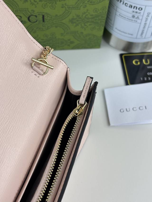 Guccl Chain wallet with script Gucci logo. The small leather accessories collection seamlessly blends modern fashion elements, creating timeless pieces that are timeless and reminiscent of classics, bringing a fresh touch to formal leather pieces. This chain wallet is expertly crafted from pink leather and cleverly detailed with the script Gucci logo in gold. Featuring pink leather, gold-tone hardware, taffeta lining, and script Gucci logo details, the interior includes six card slots, a flat pocket, a gusseted zip pocket, and an open compartment. It also features a chain strap and snap closure.