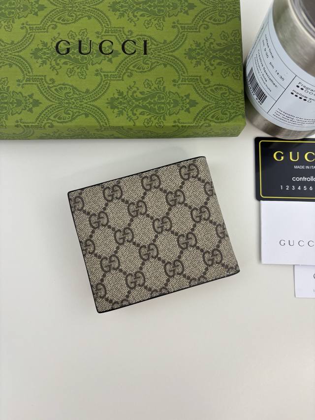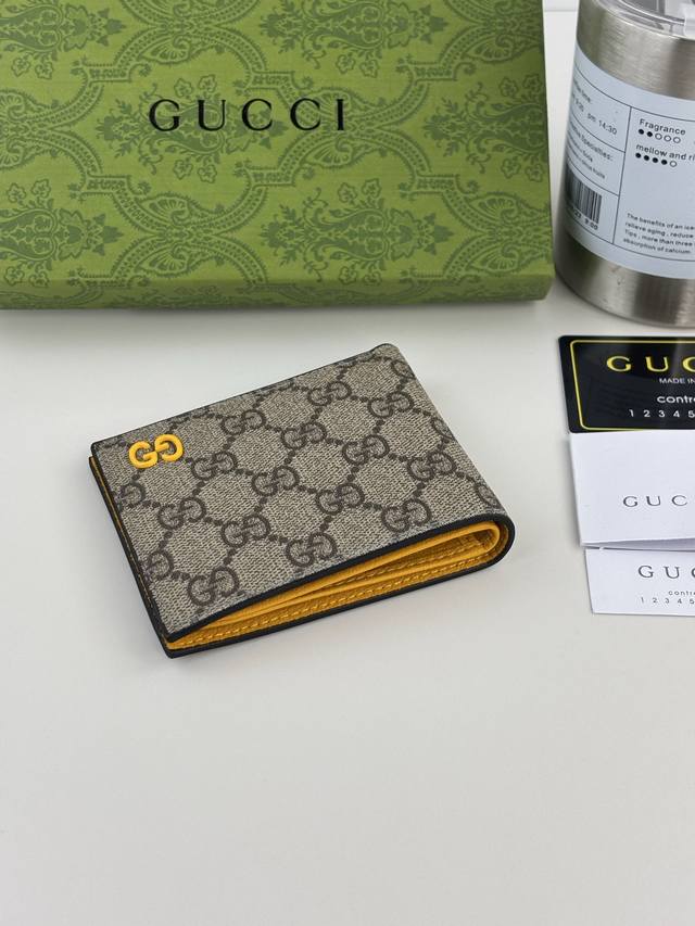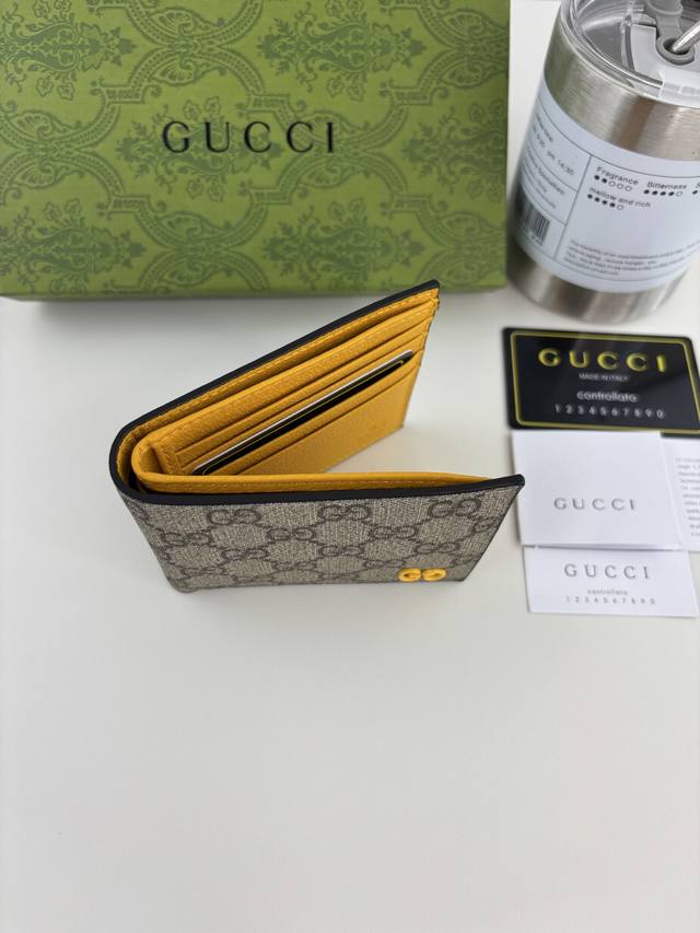 Guccl! Gucci's small leather accessories push the boundaries of design, constantly reinterpreting classic pieces in unique ways. This men's wallet expertly combines classic Gg Supreme brown canvas with yellow Gg hardware for a modern and stylish accessory.