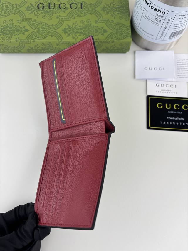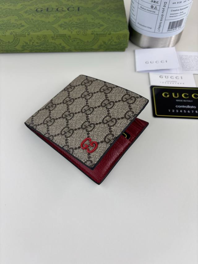 Guccl! Gucci's small leather accessories push the boundaries of design, constantly reinterpreting classic pieces in unique ways. This men's wallet expertly combines classic Gg Supreme brown canvas with red Gg hardware, creating a modern and stylish accessory.