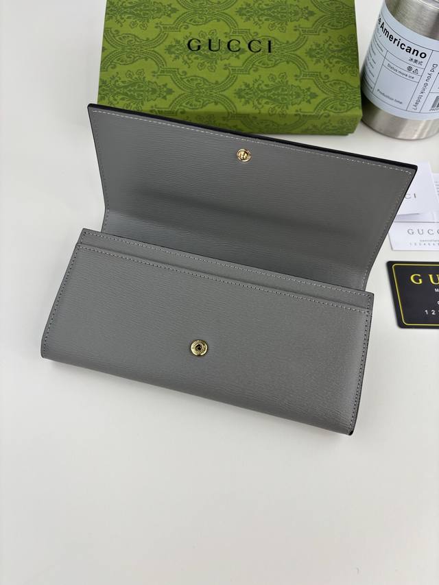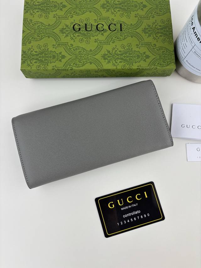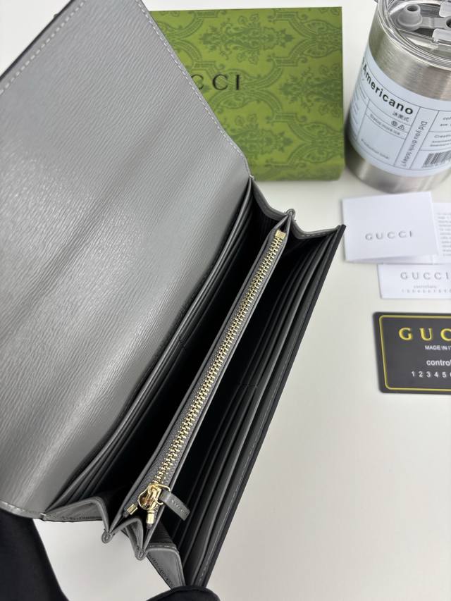 Guccl Long wallet with handwritten Gucci logo. Exploring unlimited self-expression has become part of the brand's design ethos. This wallet is expertly crafted from gray leather and embellished with gold-tone hardware featuring the handwritten Gucci logo , adding a touch of signature charm. Gray leather, gold-tone hardware, taffeta lining, and handwritten Gucci logo details.