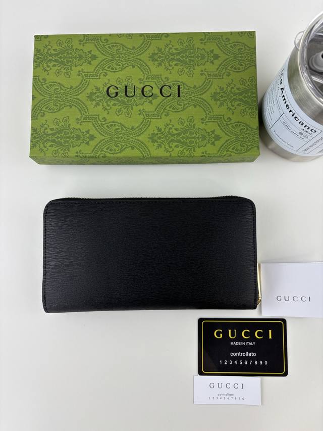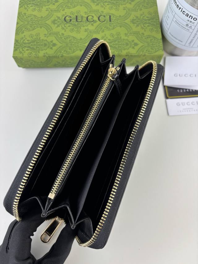 Guccl Long zip around wallet with handwritten Gucci logo. Exploring self-expression with limitless possibilities has become the essence of the brand's design. This long wallet is expertly crafted from black leather and embellished with gold-tone hardware featuring the handwritten Gucci logo, adding a touch of signature charm. Black leather, gold-tone hardware, taffeta lining, and handwritten Gucci logo details.