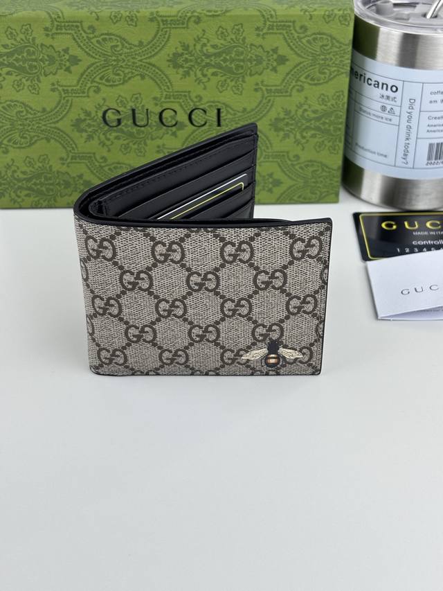 Guccl new men's short wallet! Counter synchronization, black leather, with PVC fabric silk screen latest bee logo oil edge fine workmanship, simple and generous, fashionable and domineering,