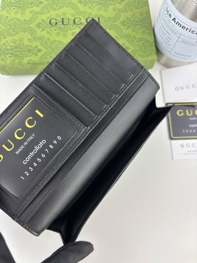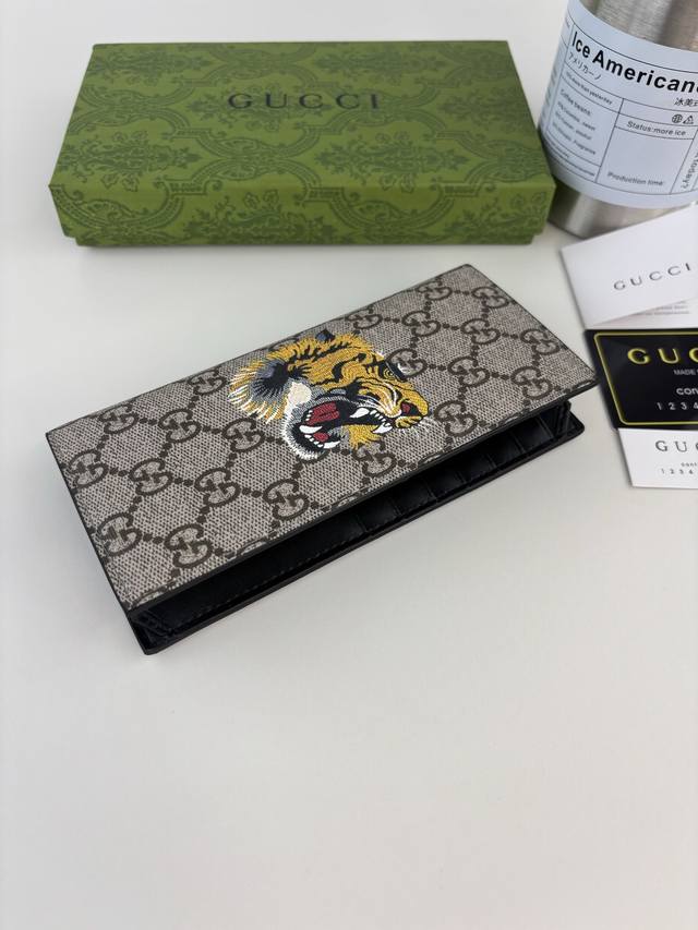 Guccl New Men's Suit Clip! Same as boutique style, black leather with PVC fabric, silkscreened tiger head logo, fine workmanship, simple and elegant, stylish and powerful. Style No.: 451275 Size: 18cm x 9cm x 2cm Color: Brown with tiger head logo