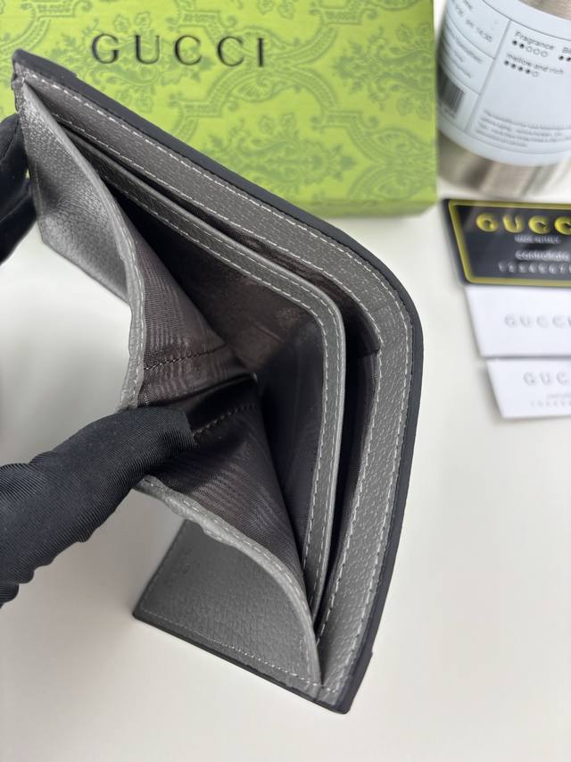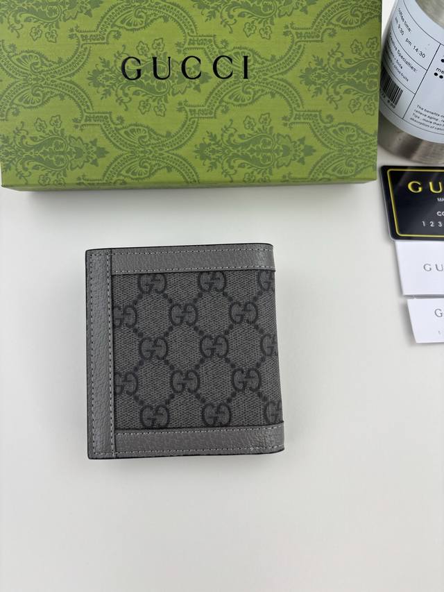Guccl Ophidia card holder. The GG logo is an evolution of the Gucci diamond quilting pattern, which first appeared in the 1930s and has since become a Gucci tradition. This new Ophidia card holder features this instantly recognizable pattern in gray. Double G hardware completes the look: gray Gg Supreme canvas, gray leather trim, palladium-tone hardware, and the Double G.