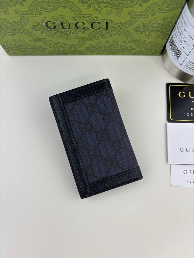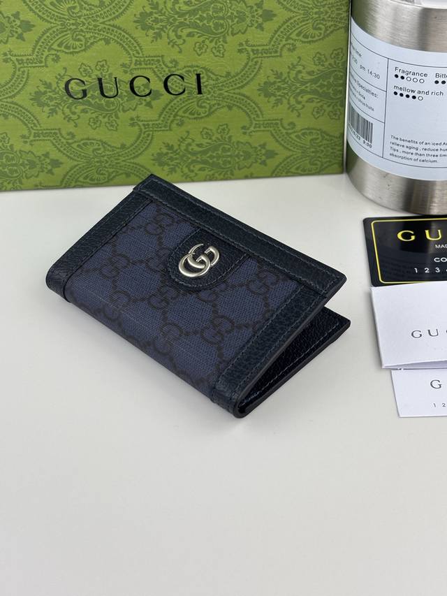 Guccl Ophidia series short wallet. The GG logo is an evolution of the Gucci diamond quilting pattern that appeared in the 1930s and has since become a Gucci tradition. This new Ophidia series card holder uses this recognizable pattern in blue material. Double G hardware adds a touch of charm to the look. Blue Gg Supreme canvas, blue leather trim, palladium-tone hardware, and Double G are all added.