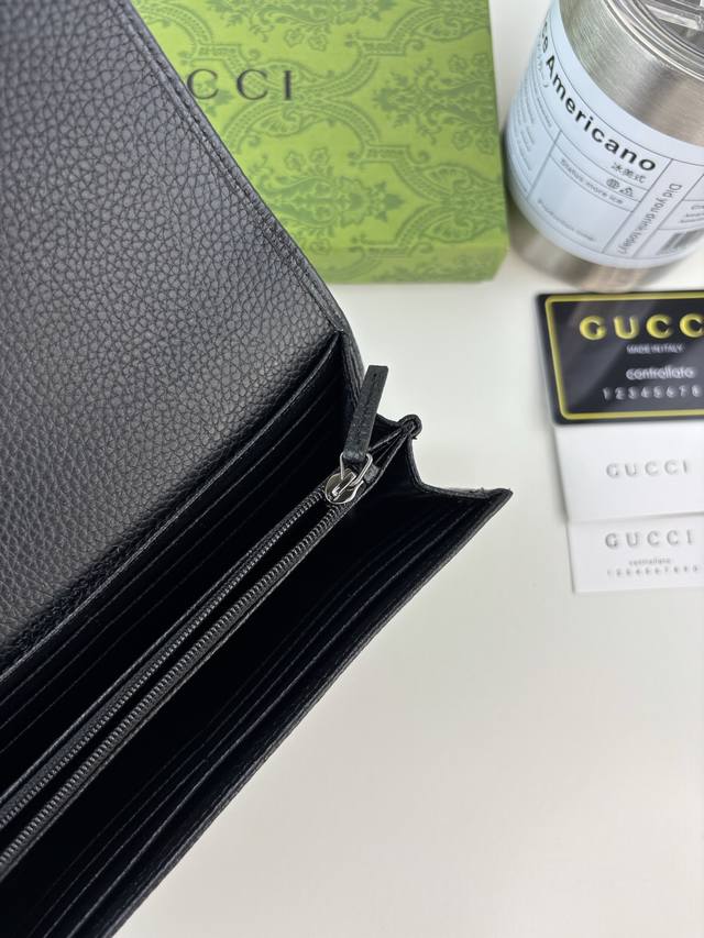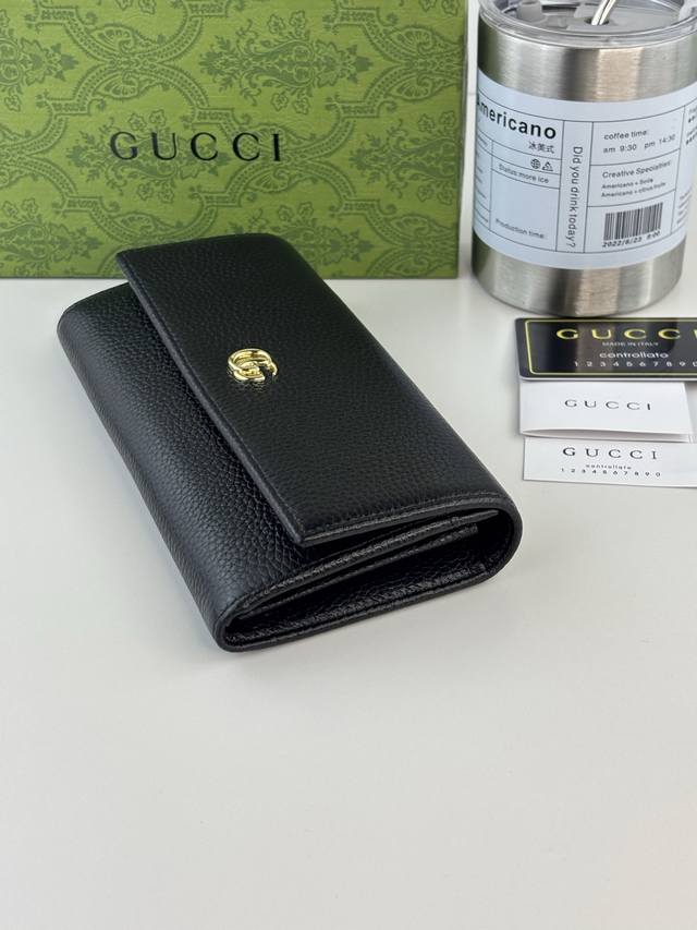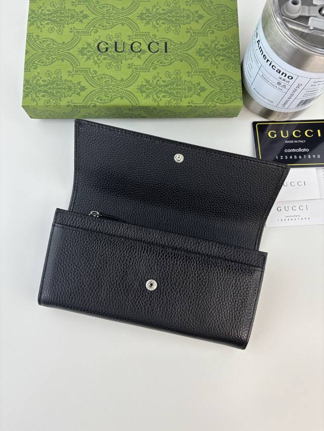 Guccl Summer New Arrival. A small double-G metal embellishment deepens the subtle yet sensual G of the logo, paired with a unique variation of the original color scheme. The iconic house design is reintroduced. The exterior is black leather, and the interior is crafted from black leather. The bag has a snap closure. Style No.: 456116. Dimensions: 19cm x 10cm x 3cm. Color: Black with gold hardware.