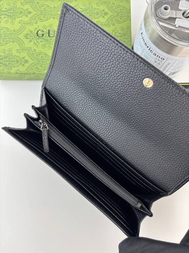 Guccl Summer New Arrival. A small double-G with black metallic trim, deepening the subtle yet sensual G of the logo. Combined with the original color scheme and a unique variation, it reintroduces the iconic house design. The exterior is black leather, and the interior is crafted from black leather. The bag has a snap closure. Style No.: 456116. Dimensions: 19cm x 10cm x 3cm. Color: Black with black buckle.