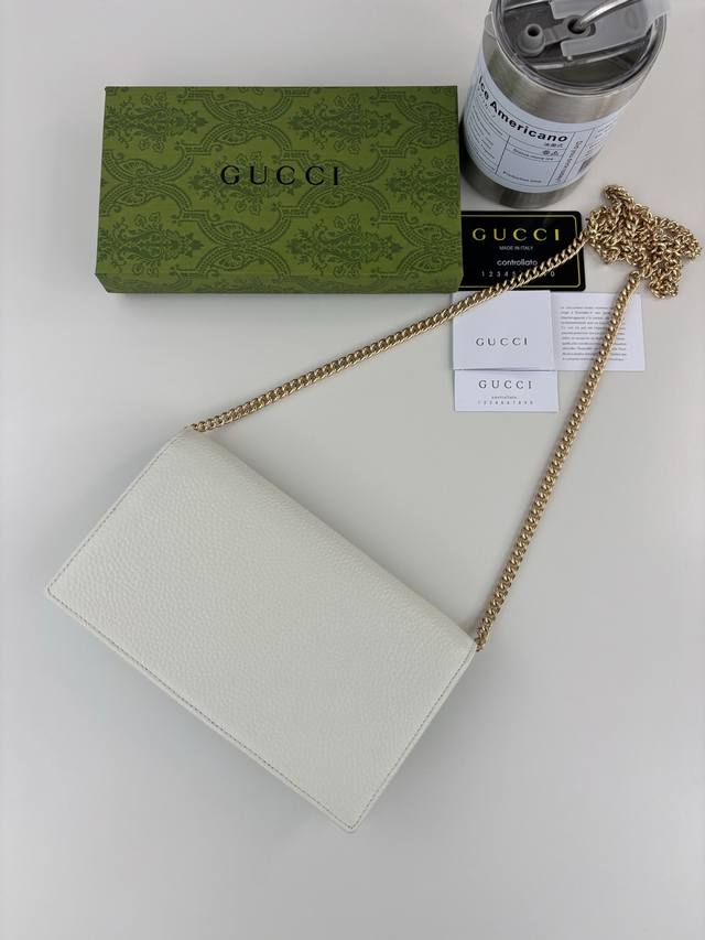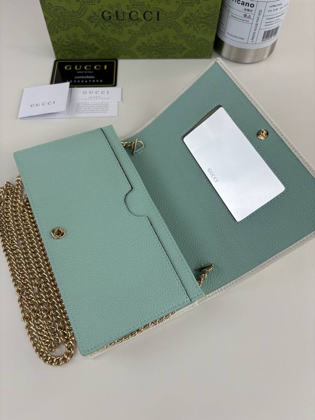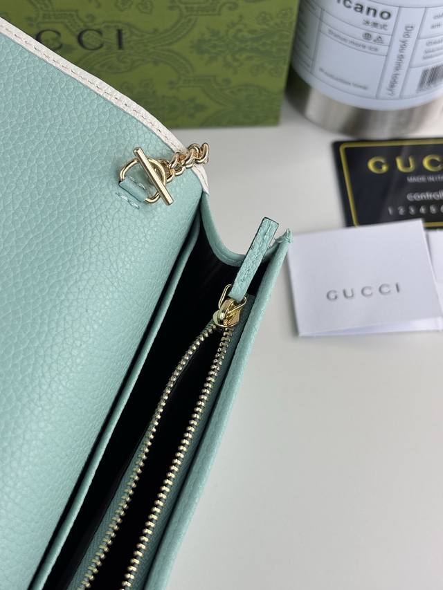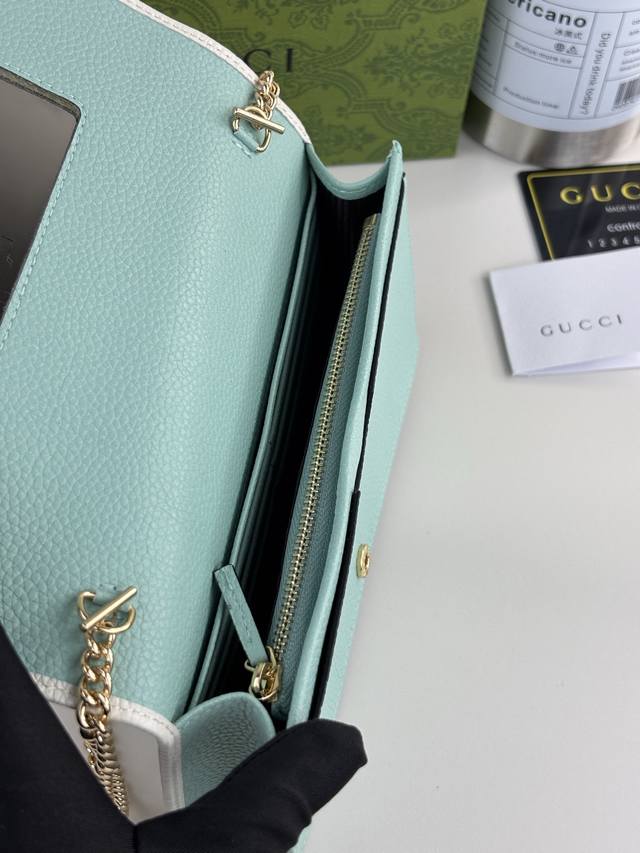 Guccl summer new style, small double G metal decoration, deepen the hidden logo sensual G, with the original color combination and unique deformation, re-launch the iconic house design, the exterior is white leather, the interior is a fashionable product made of blue leather two-tone! The bag has a snap closure