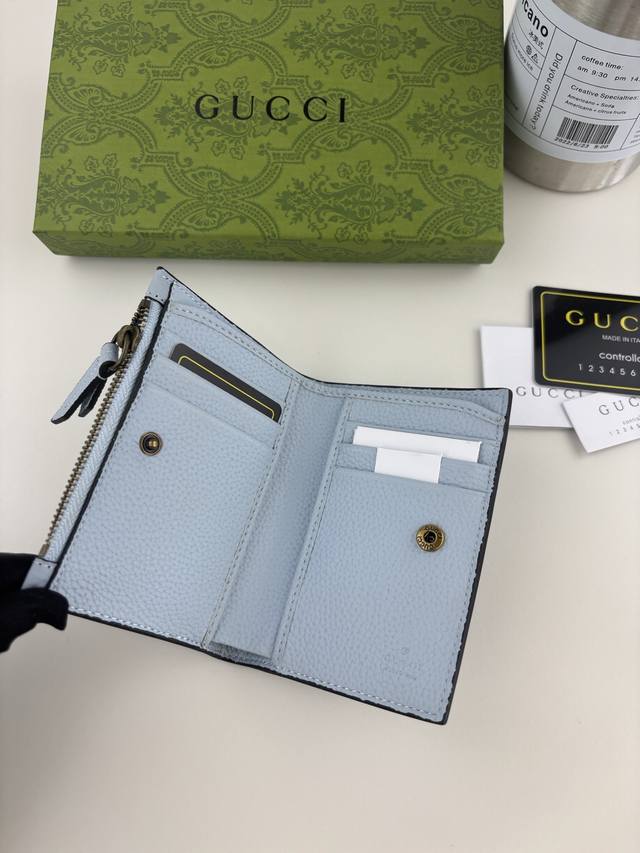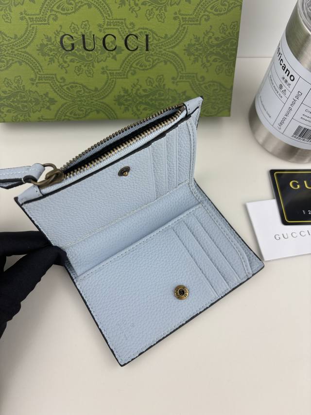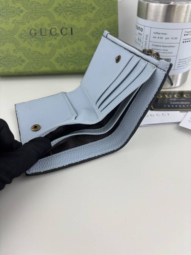 Guccl summer series, the new wallet is made of blue leather, the front bow is made of original python leather piping and gold-tone interlocking double G details.
