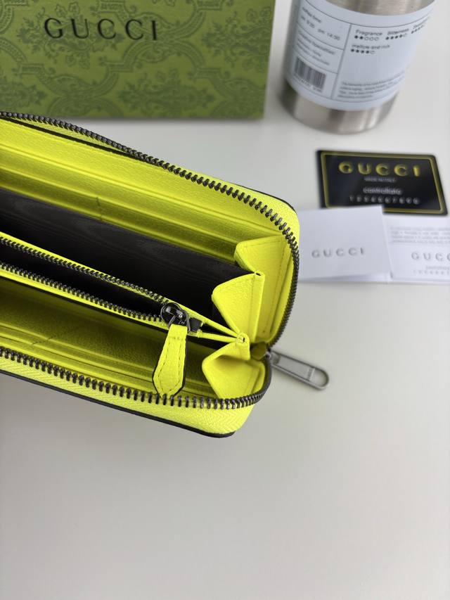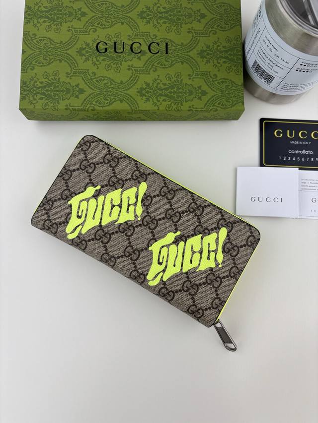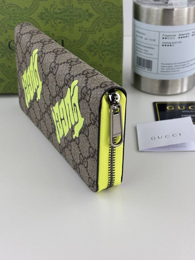 Guccl This zip-around wallet is crafted from coated fabric with the iconic Gg monogram pattern, enhanced by the Gucci print and contrasting leather trim. 12 card slots, 3 open bill pockets, and a zip pocket. Style: 835324