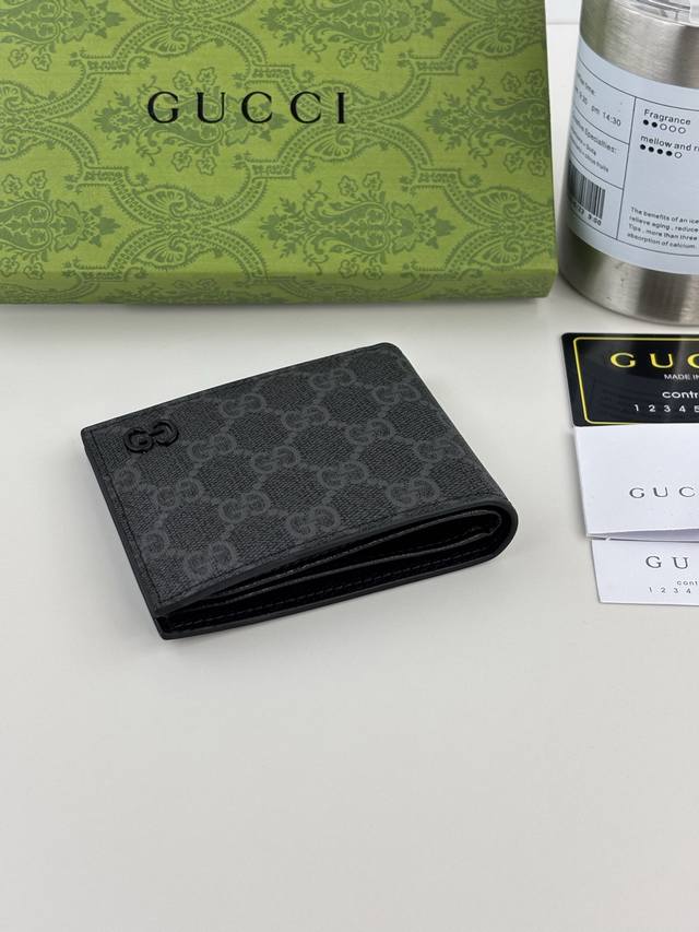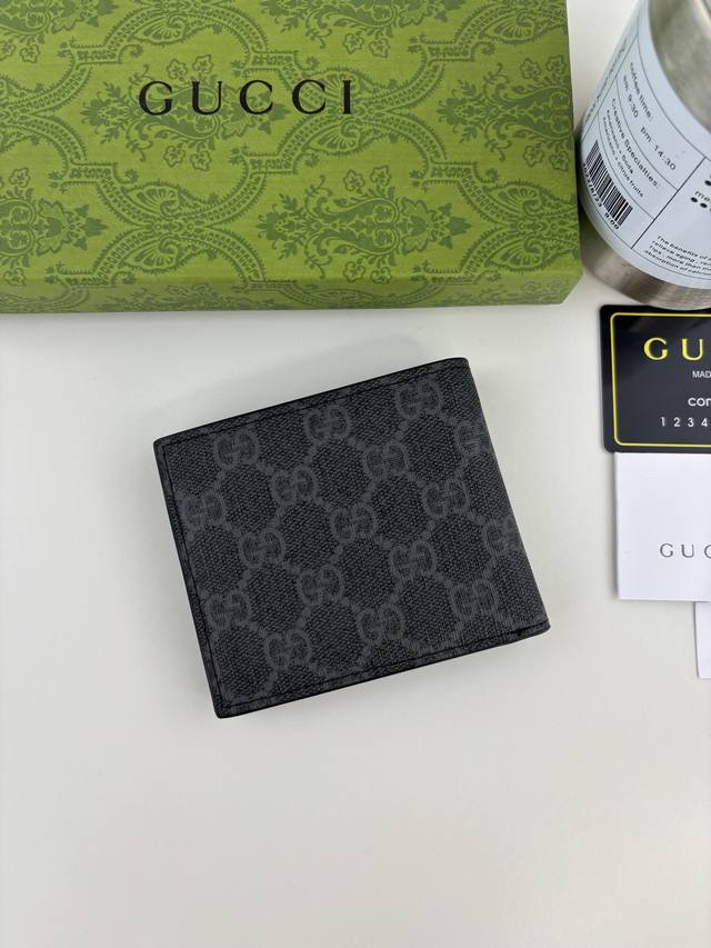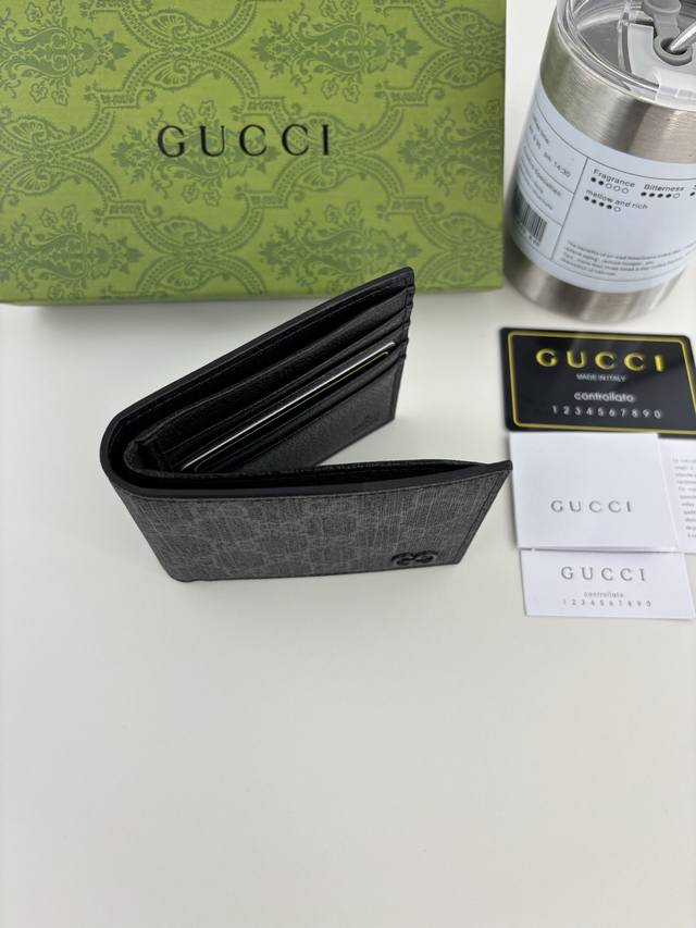Guccl wallets, a new collection of slim and compact small leather goods, are refreshed with a vibrant palette of colors. The contrasting two-tone design highlights the Gg logo. Crafted from black Gg Supreme canvas with a black leather interior, this wallet features eight card slots and two bill compartments.