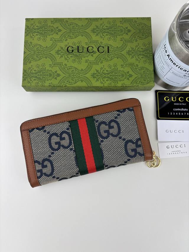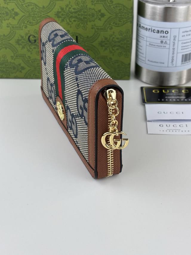 Guccl zip-around wallet. The Gg logo, introduced in the 1970s, evolved from the early Gucci diamond quilting, which originated in the 1930s. This zip-around wallet combines the iconic pattern with striped web, a classic pairing that pays homage to the Gucci brand's roots. Crafted from brown ebony Gg Supreme canvas with brown leather trim, it features gold-tone Double G hardware, 12 card slots, 3 bill compartments, a zippered coin pocket, and a zip-around closure.