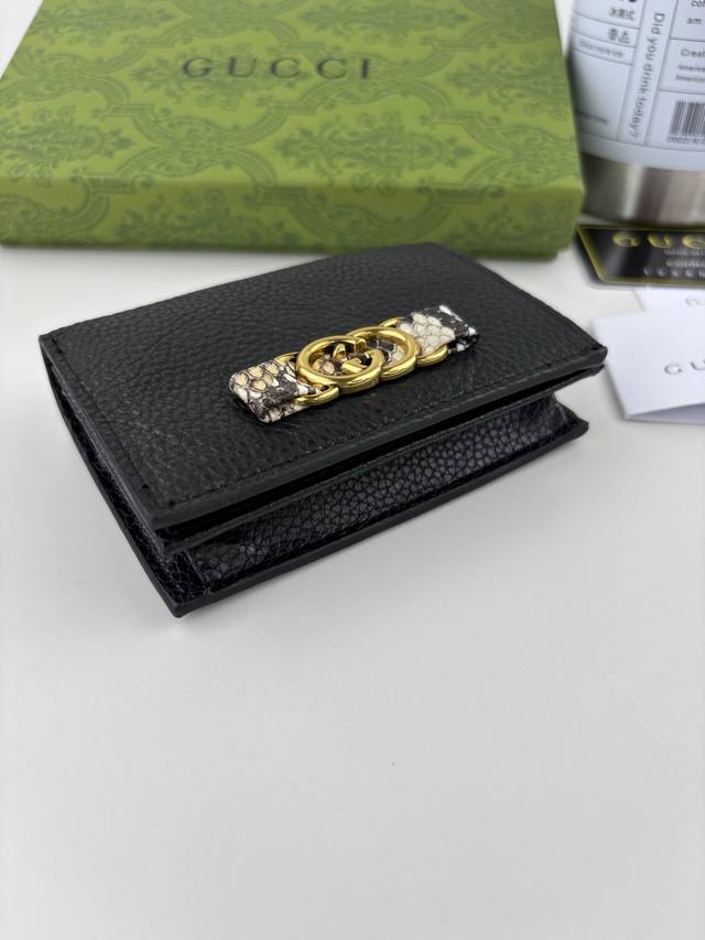 Guccl's latest ~ small wallet with an interlocking double G python leather bow. Crafted from original factory p calfskin, the front bow is made of python leather piping and antique gold-toned interlocking double G details. This iconic fashion item is