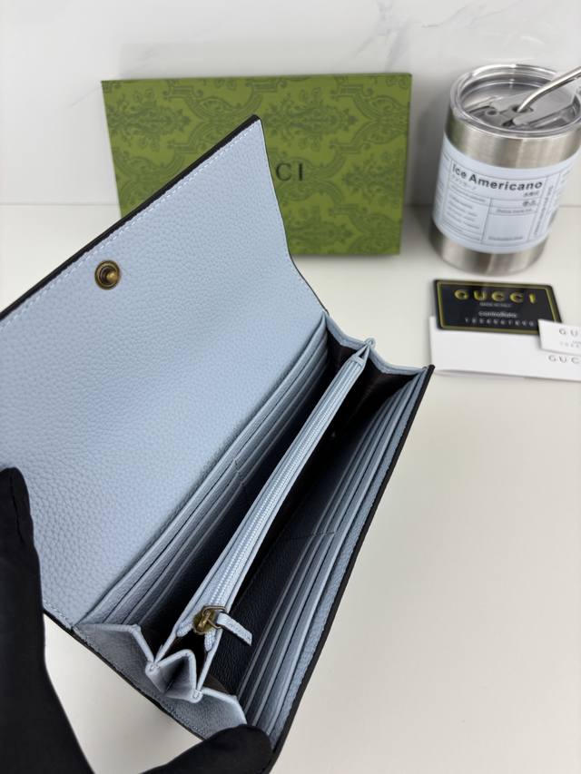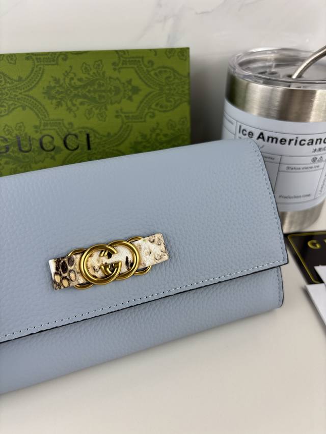 Guccl's latest wallet featuring an interlocking G python bow. Crafted from genuine factory calfskin, the front bow features python piping and antique gold-toned interlocking G details. This iconic fashion item is available in two styles: Style No. 750461 and Dimensions: 19cm x 10cm x 3.5cm. Color: Blue.