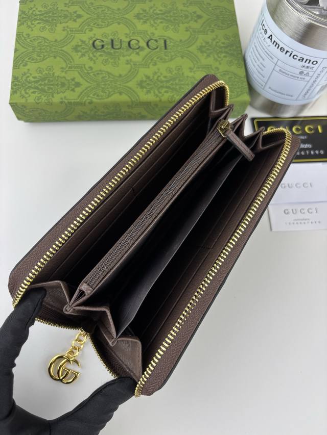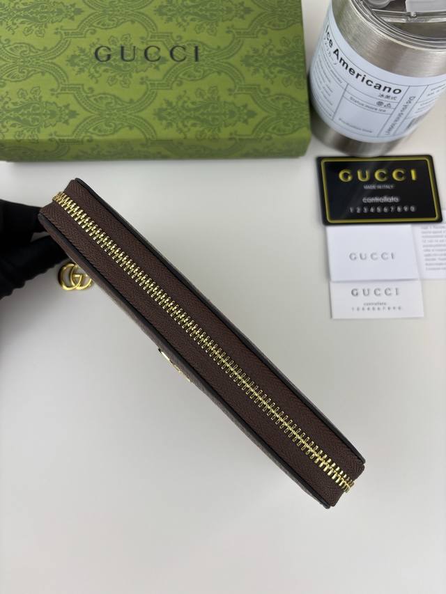 Guccl's new zip-around wallet features the brand's recognizable elements, including monogram detailing. Crafted from double-patterned canvas, this wallet boasts a unique scale and exudes a modern flair. Features camel and ebony Double G canvas, brown leather trim, viscose lining, Double G hardware, and details including 12 card slots, a zippered coin pocket, and three bill compartments. Style No. 523154. Dimensions: 19cm x 10cm x 2.5cm. Color: Fabric with Big G, Brown.