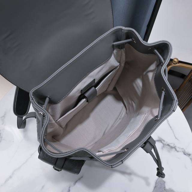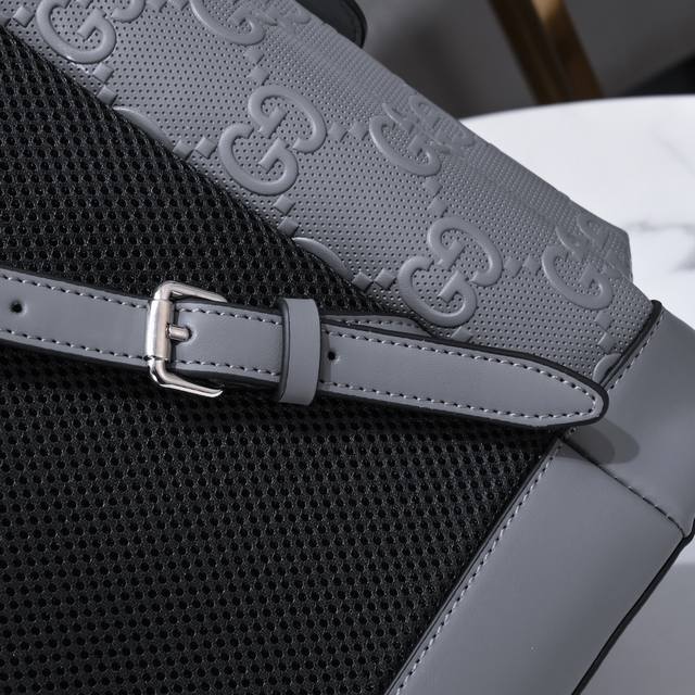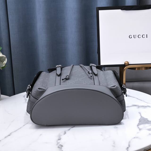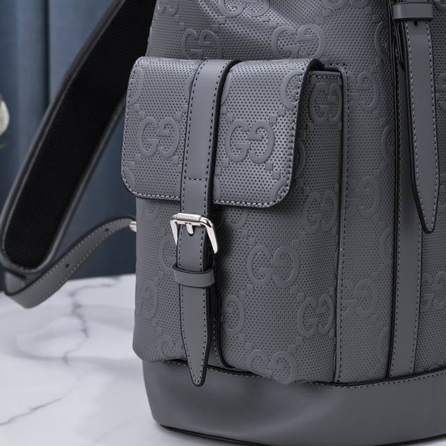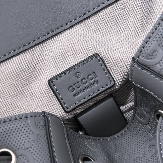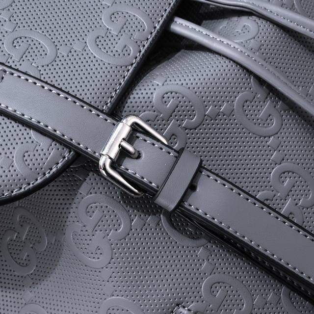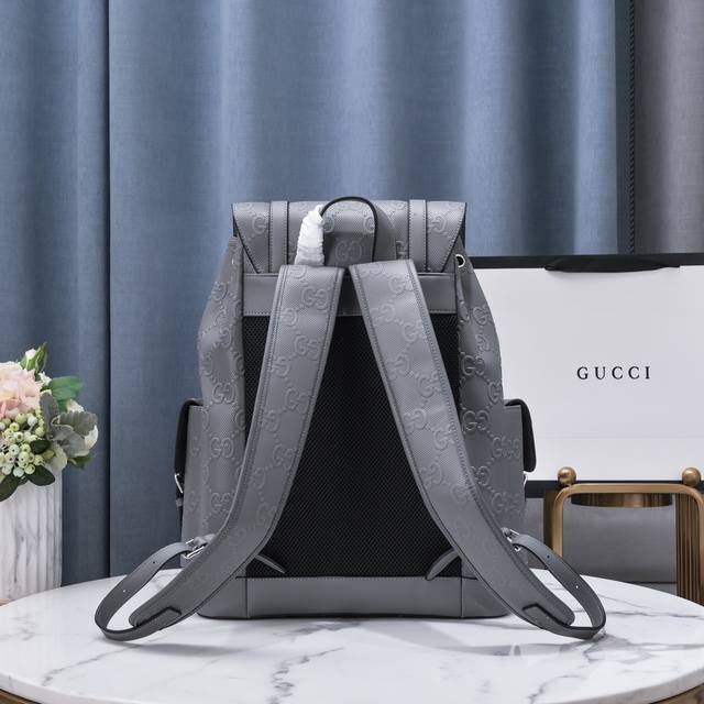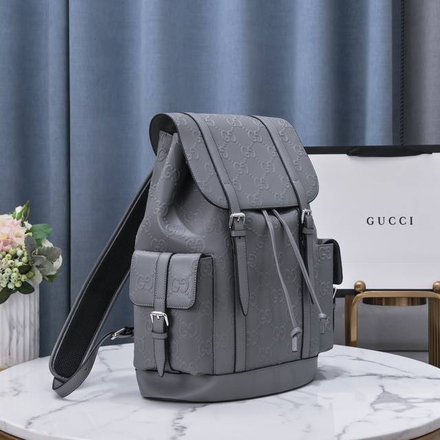 Original Gucci Signature Leather Classic Backpack (450459) from the official website, featuring a flap zip pocket, multiple interior pockets, and a protective iPad compartment. Made of Gucci Signature calfskin, the leather boasts a clear and distinct pattern on the surface and a substantial feel. Color: Grayish-blue; Dimensions: 34*16*42cm. A classic and versatile style.