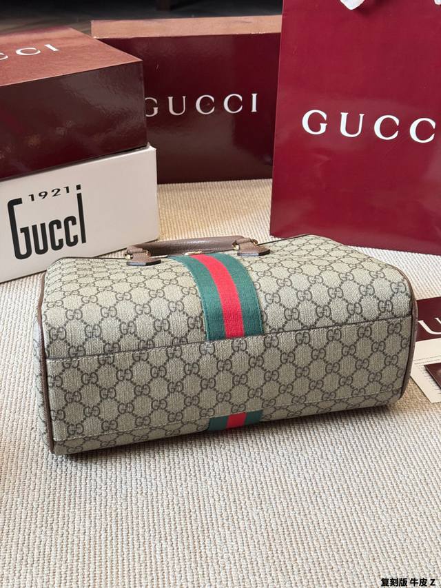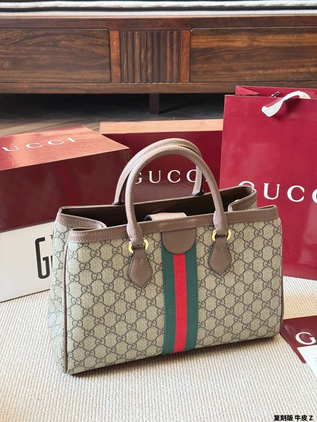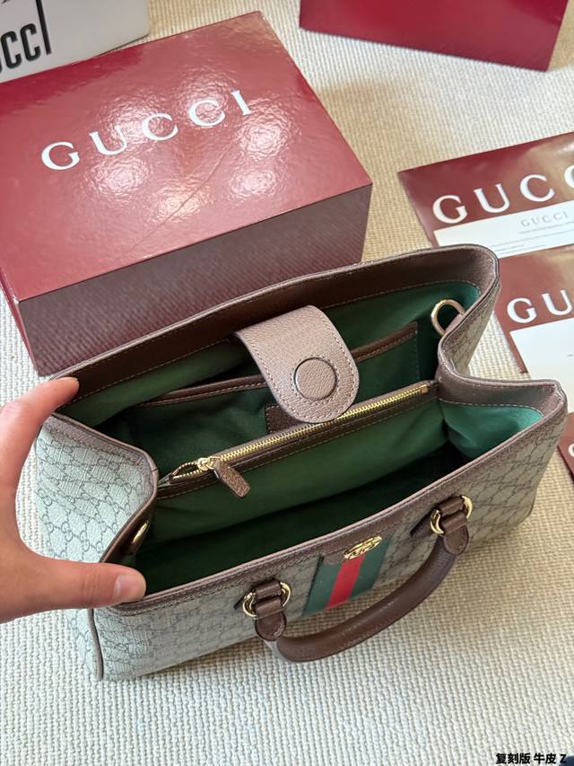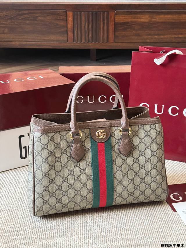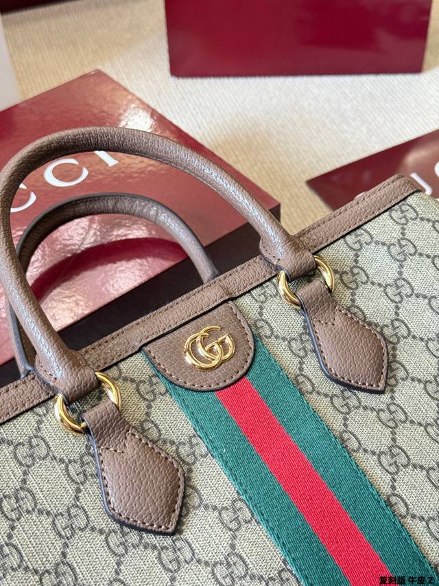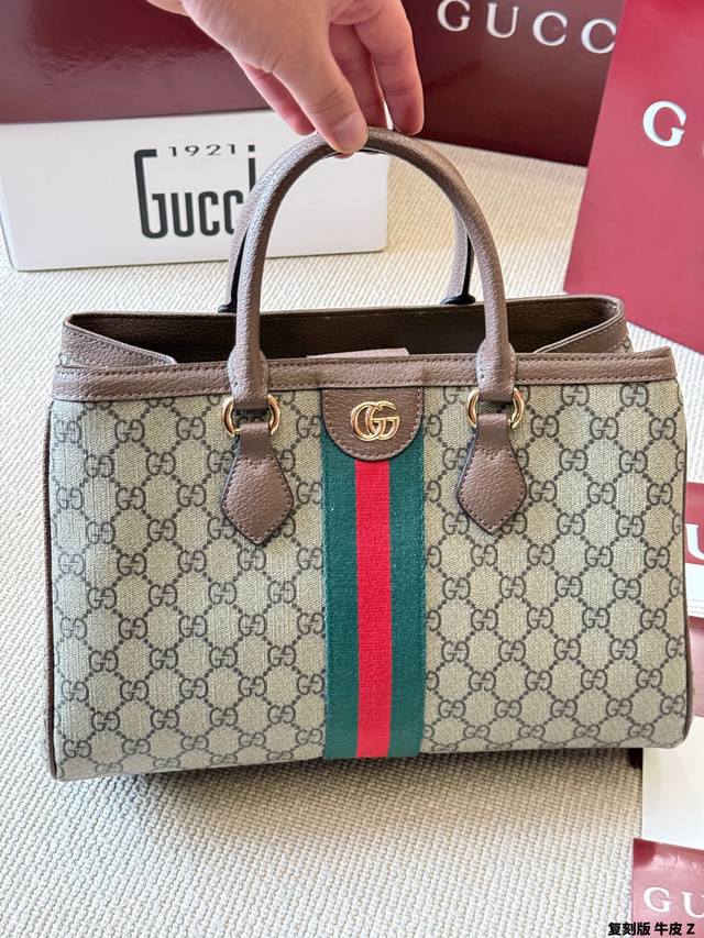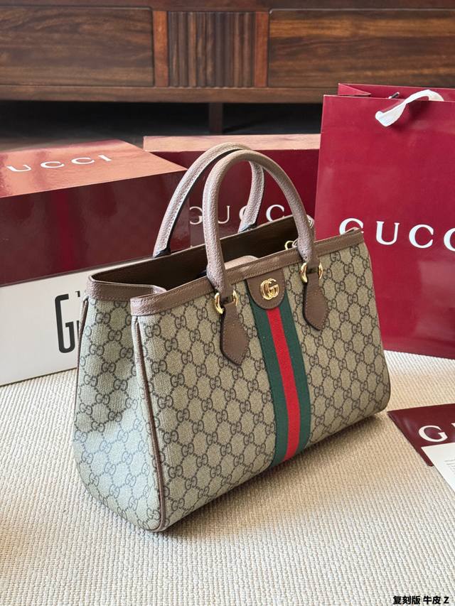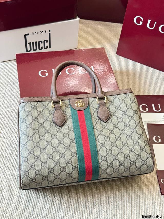 Replica Gucci Ophidia Series Gg Tote Bag in cowhide leather. This Gucci Ophidia series Gg tote bag features beige and white Ggsupreme canvas with oatmeal-colored leather trim, gold hardware, and red and green webbing, exuding a retro feel. Measuring 33x23x14cm, it's spacious and practical for commuting or short trips! The interior has a cotton-linen lining and a zippered inner pocket for easy organization. It features a magnetic snap closure and double leather handles for hand-carrying or shoulder-carrying. Inspired by the 1930s, this practical and stylish bag is a classic Gucci piece and a perfect addition to any everyday outfit.