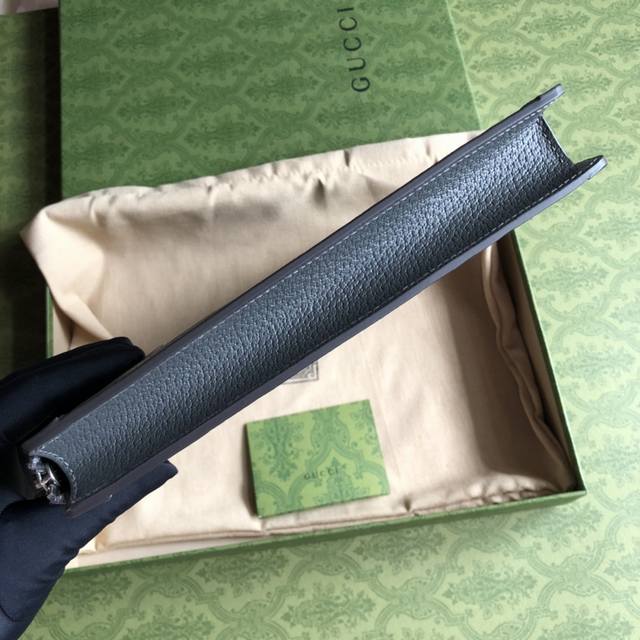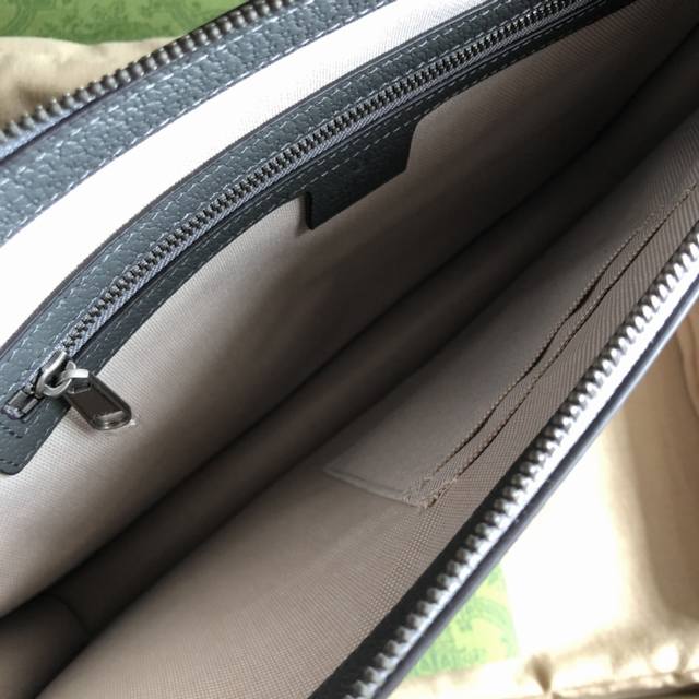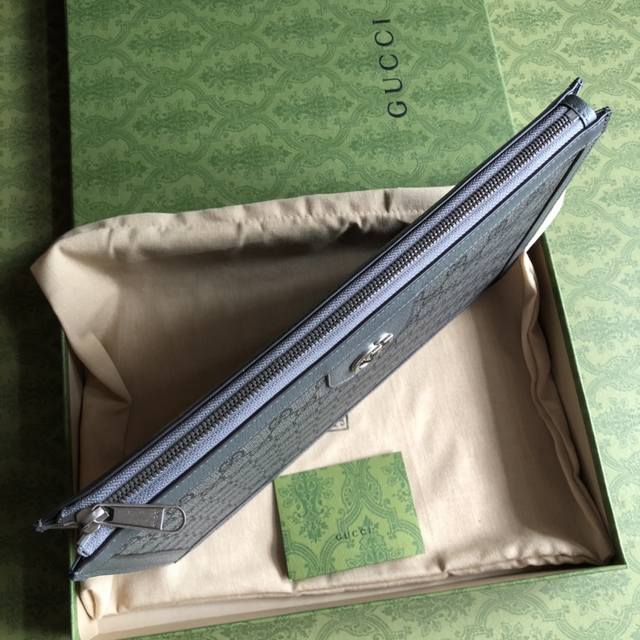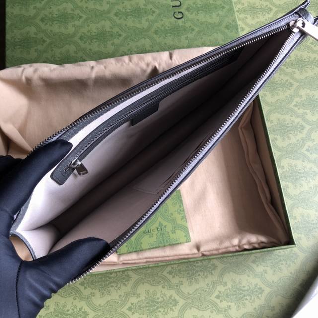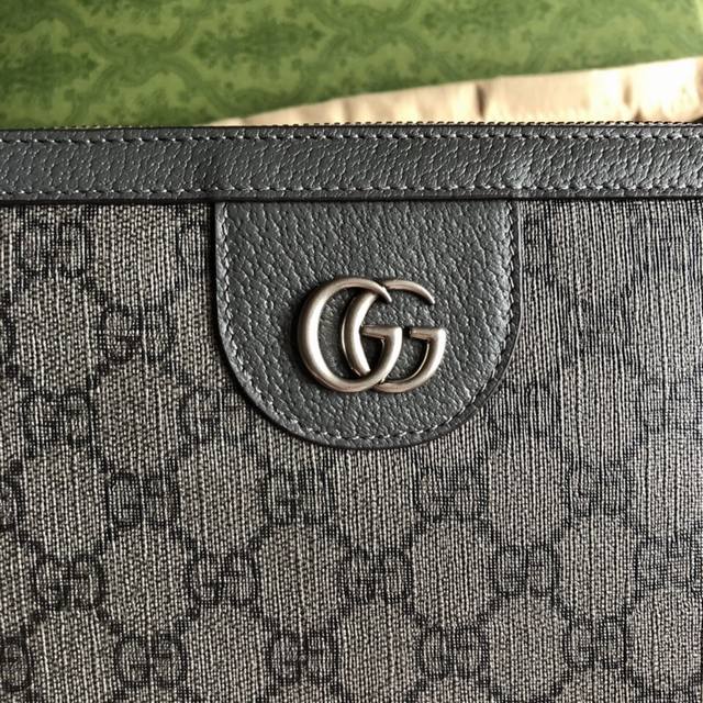 This premium, high-quality Ophidia clutch features the Gg logo, a signature pattern that evolved from the Gucci diamond quilting pattern that first appeared in the 1930s and has since become a Gucci staple. This new Ophidia clutch showcases this instantly recognizable pattern in gray and black. Double G hardware completes the look, featuring gray and black Gg Supreme canvas, gray leather trim, palladium-tone hardware, and the Double G. Model: 674078. Dimensions: 34 x 24 x 5 cm. Color: Gray PVC.