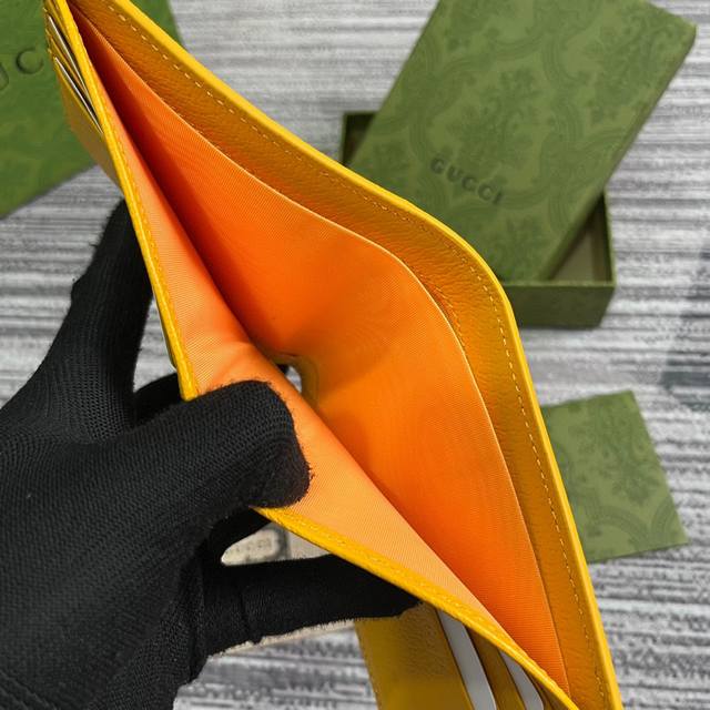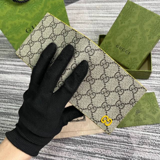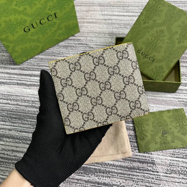 Wallet with Gg Supreme details. Gucci's small leather accessories push the boundaries of design, constantly reinterpreting classic pieces in unique ways. This men's wallet expertly combines classic Gg Supreme canvas with yellow Gg hardware for a modern and stylish accessory. Model: 768243. Dimensions: 11" wide x 9" high (closed). Dimensions: 21" wide x 9" high (open). Color: Yellow PVC.