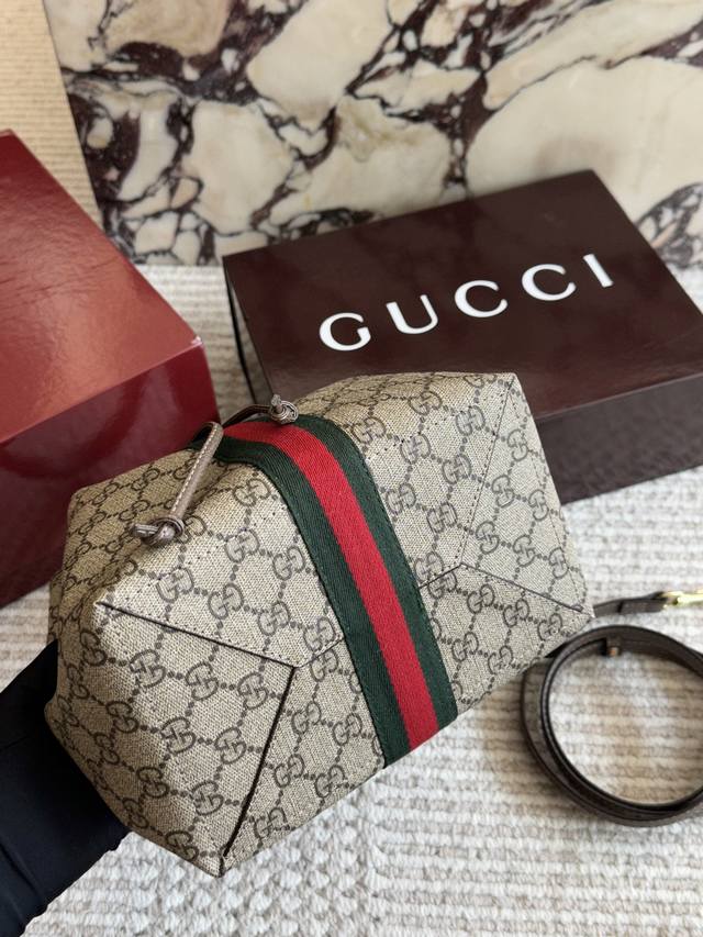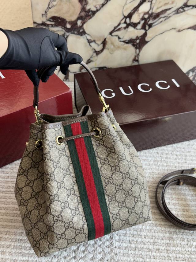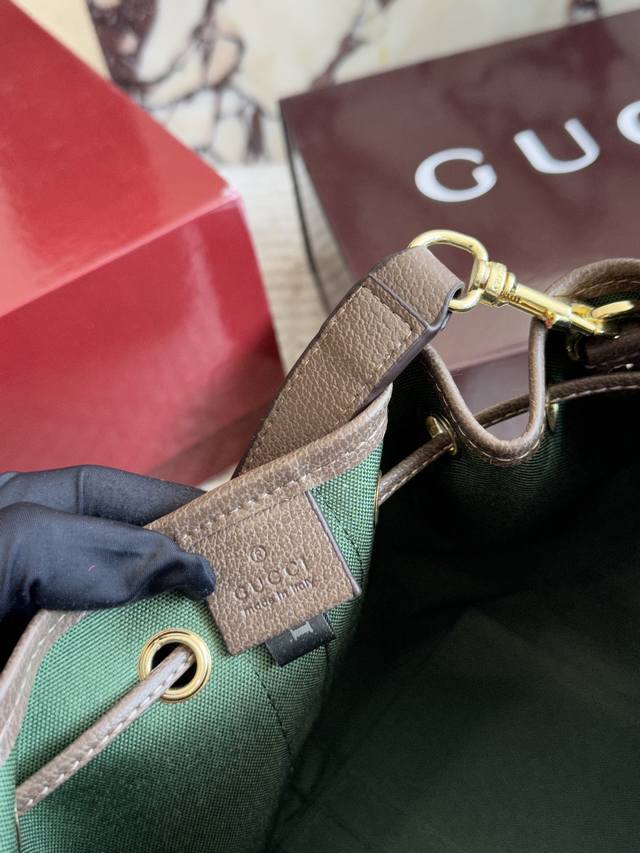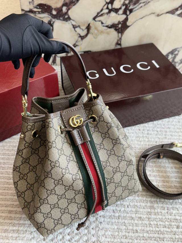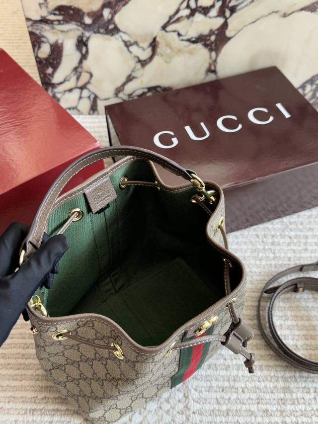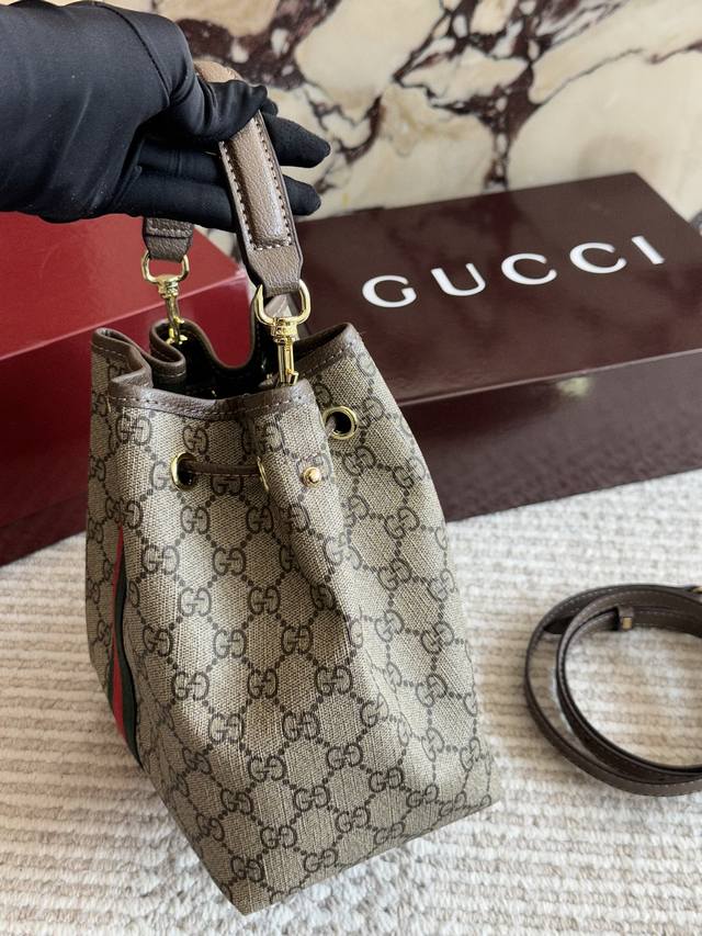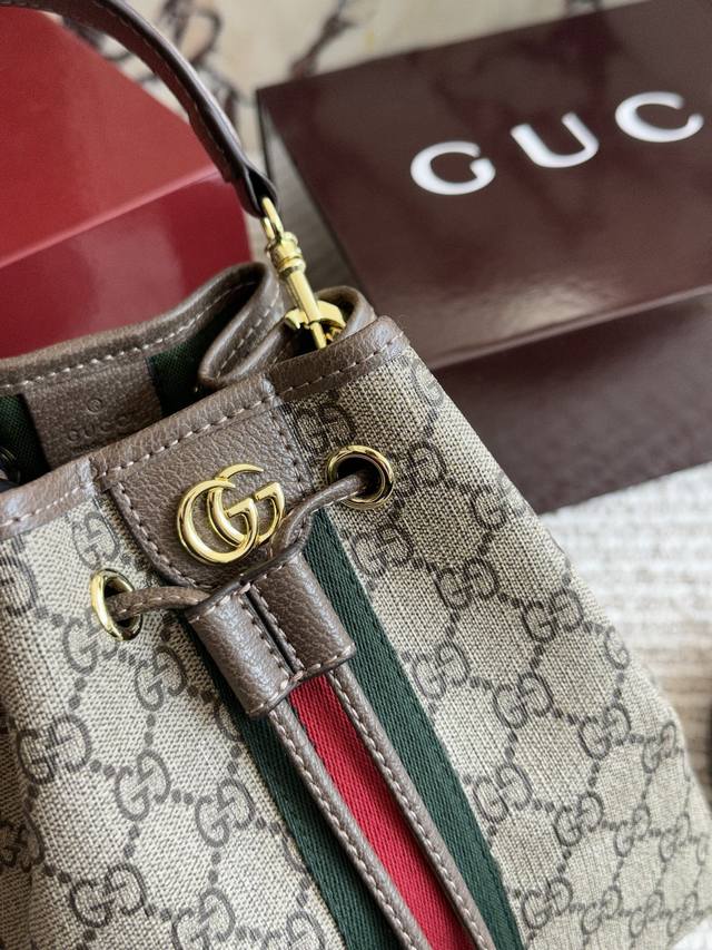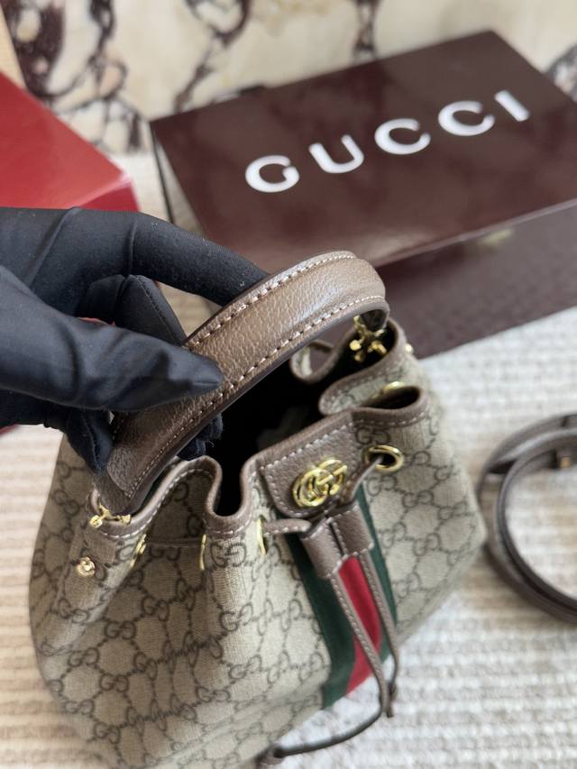Comes with a folding box. Size 21-22cm. Gucci drawstring bucket bag. Unique and eye-catching design. Stylish and versatile, this mini bucket bag is a masterpiece among small leather accessories, adorned with exquisite logo details. It can be easily paired with ready-to-wear items to effortlessly create your final look.