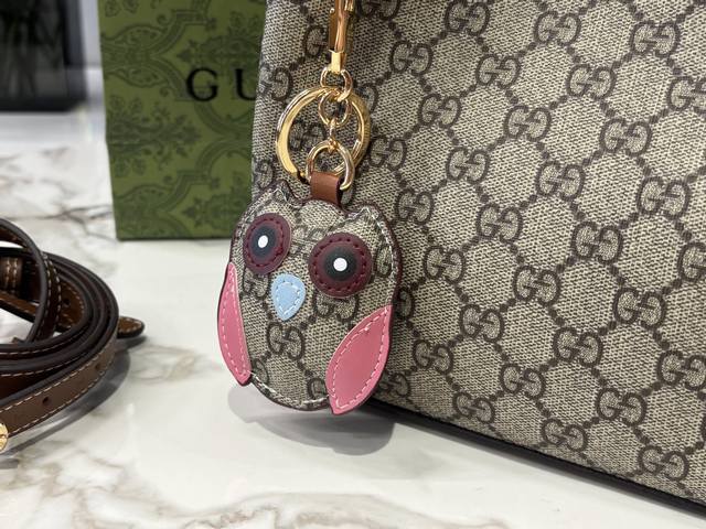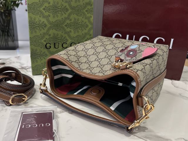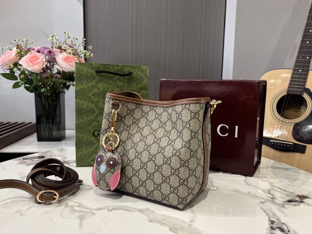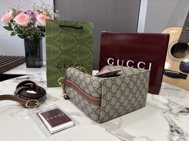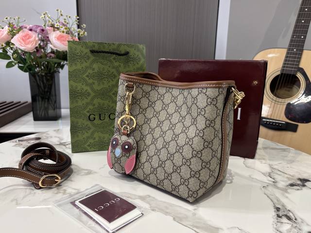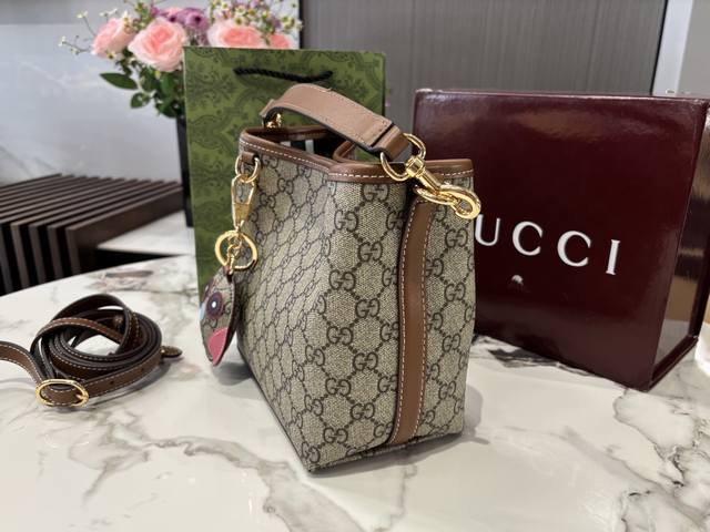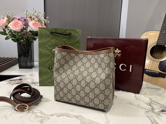 Comes with folding box, size 18.18 DDD Gucci Emblem series bucket bag DDD The new collection reinterprets the brand's timeless elegance and exquisite craftsmanship. This bucket shoulder bag embodies practical design aesthetics, featuring two main compartments lined with webbing cotton and a central zip pocket. New Gg monogram coated fabric in beige and dark brown with brown leather trim, contrasting stitching, and red and green webbing cotton lining DDD