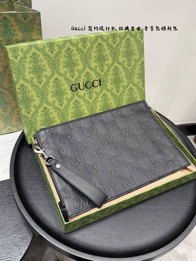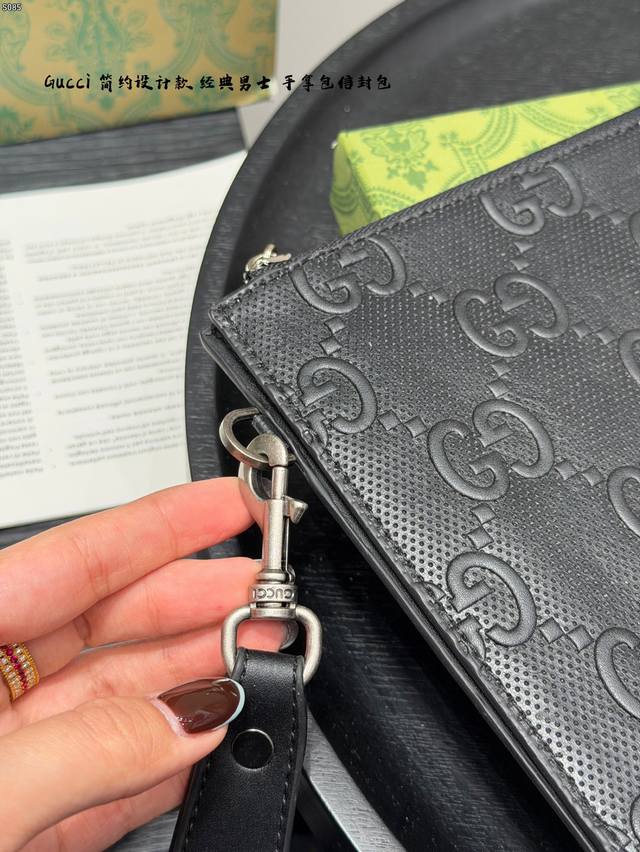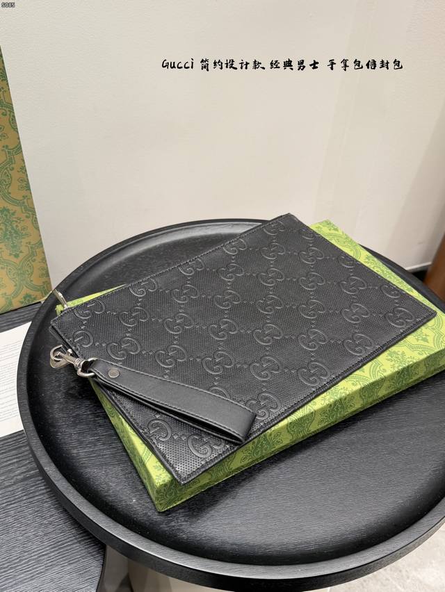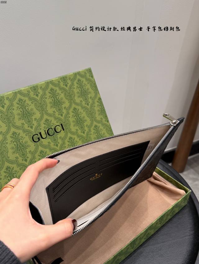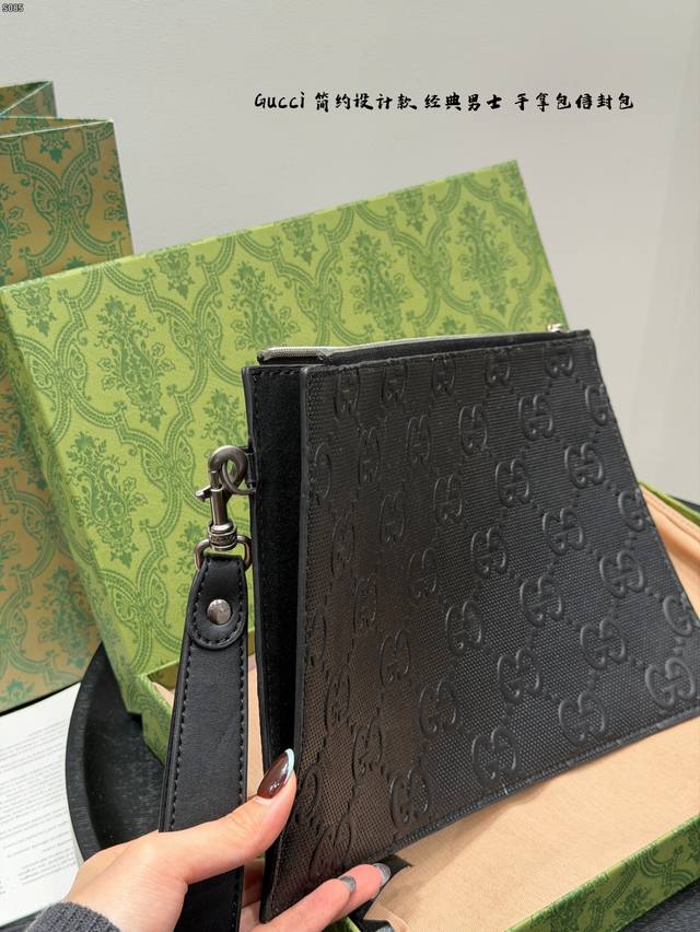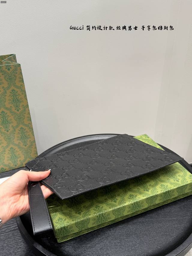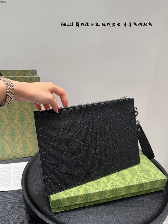 Gift Box Packaging DDD Gucci Bee Embossed Men's Clutch/Envelope Bag, made of black cowhide leather with a heat-pressed textured finish, understated yet luxurious. The front features a distinctive gold bee metal hardware, symbolizing diligence and preciousness. The interior includes card slots and compartments for easy storage of your phone and wallet. The secure zipper design makes it convenient to carry by hand or wrist, suitable for both business and casual occasions, practical and stylish. DDD Dimensions: 30.5 x 21 x 1.5 cm DDD