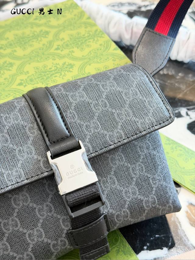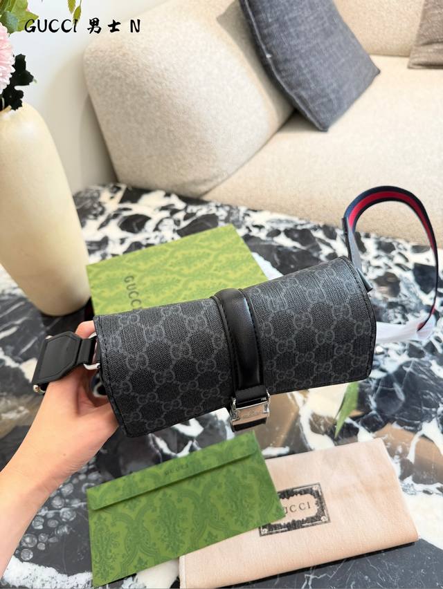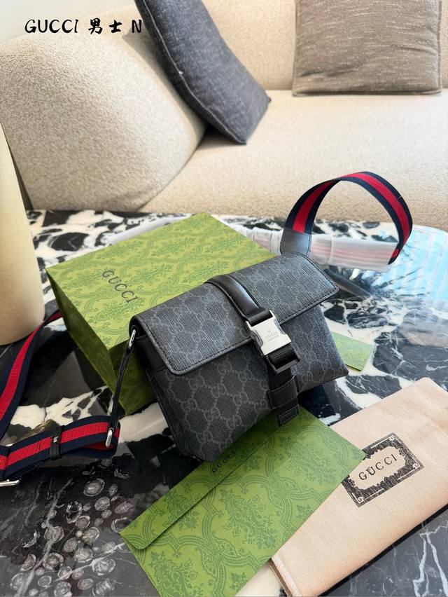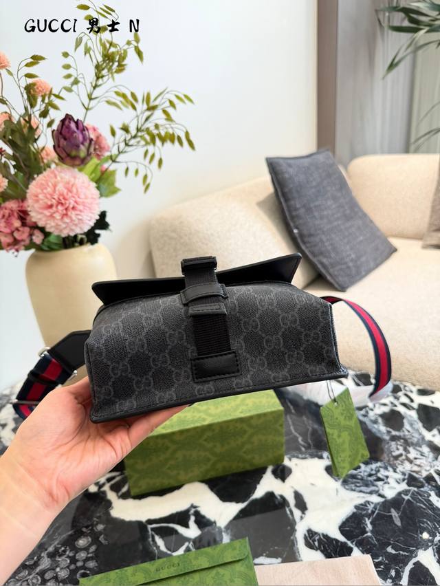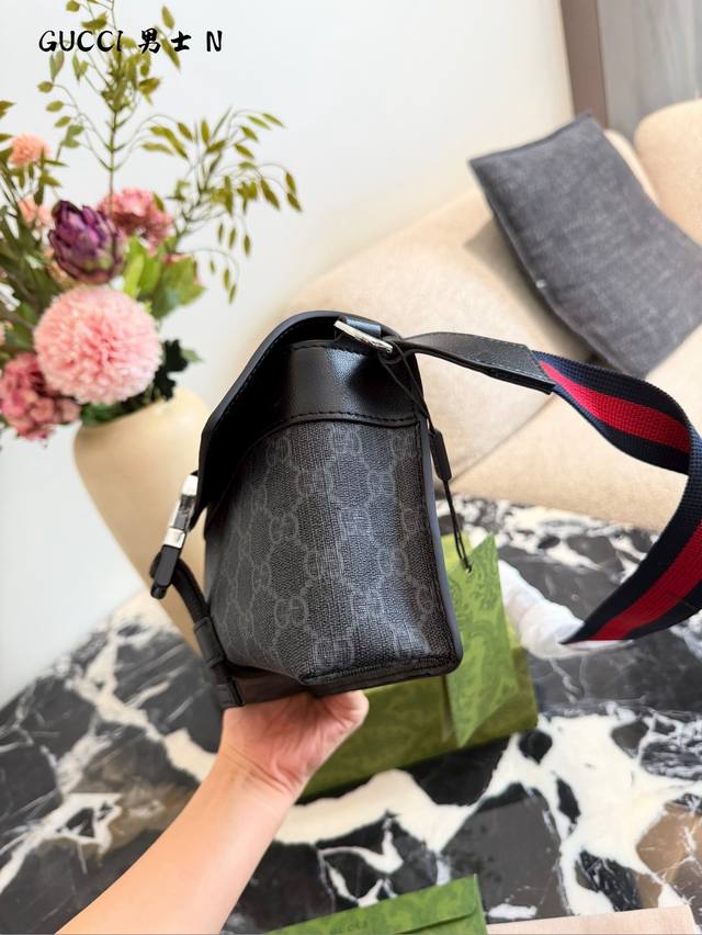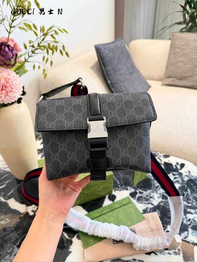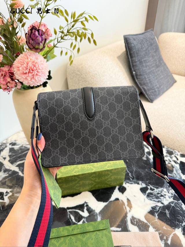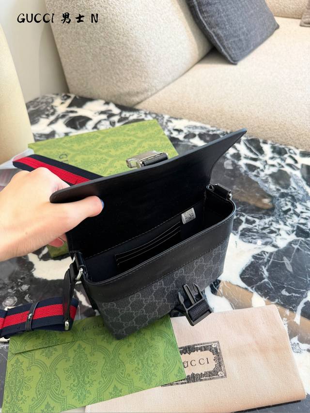 Gucci Men's Monogram Canvas Messenger Bag. This Gucci men's Monogram Canvas Messenger Bag, model 745679, features classic black GG monogram canvas and black leather, offering a retro yet practical look! It includes an interlocking double G logo tag and a magnetic closure flap. The adjustable shoulder strap allows for both shoulder and crossbody wear. The interior is lined with cotton and linen. Measuring 20 x 17 x 7.8 cm, it offers moderate capacity, making it suitable for commuting or short trips. The highly recognizable monogram pattern makes it versatile enough for both business and casual occasions, making it a top choice for men who combine functionality and style.