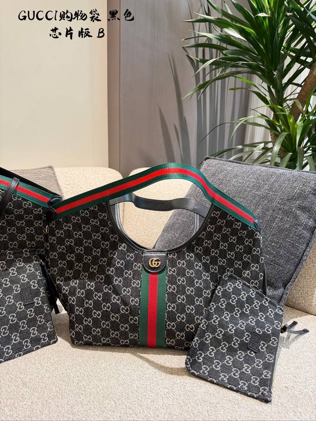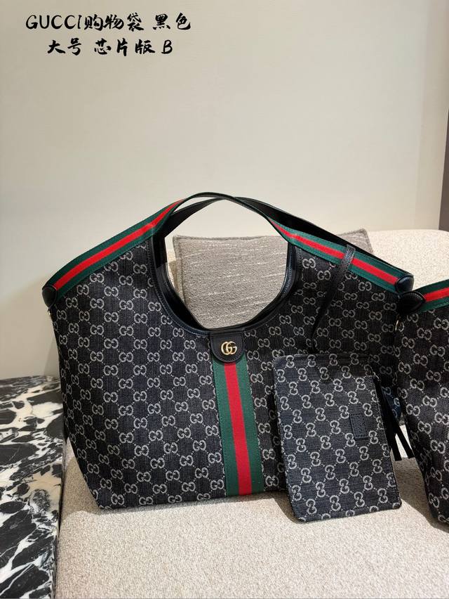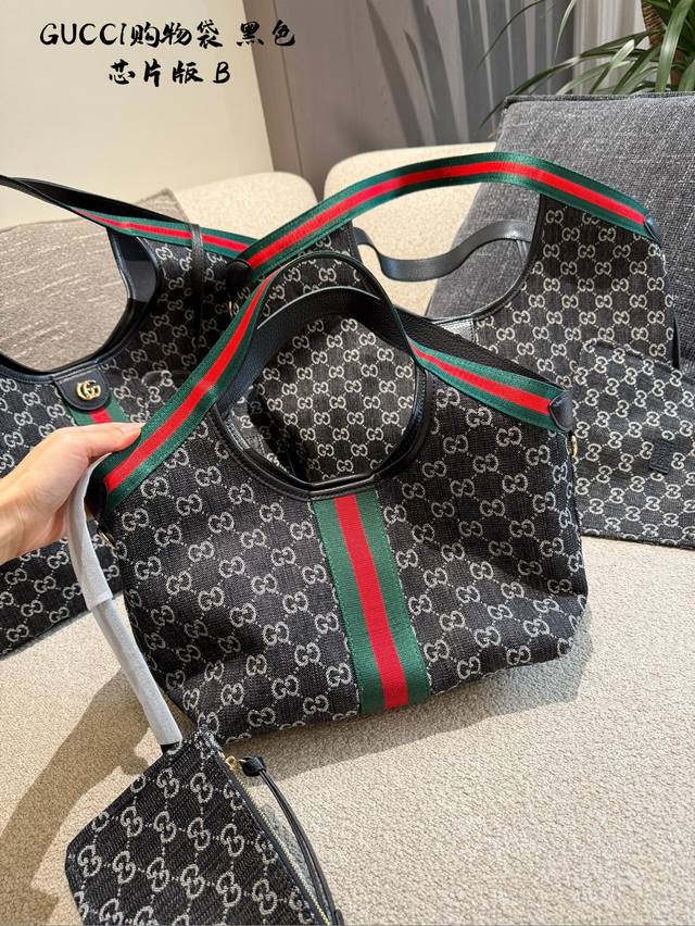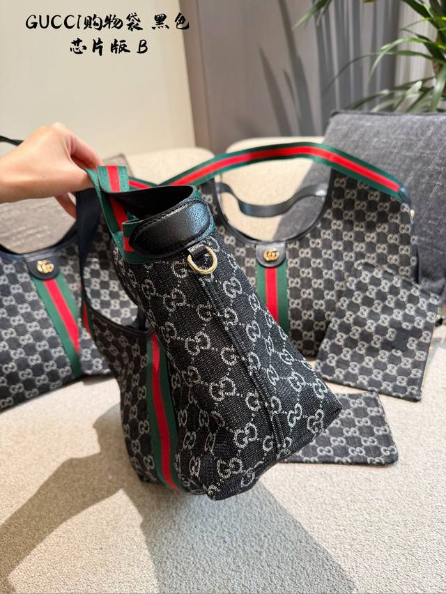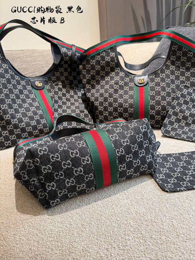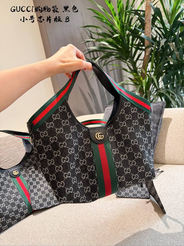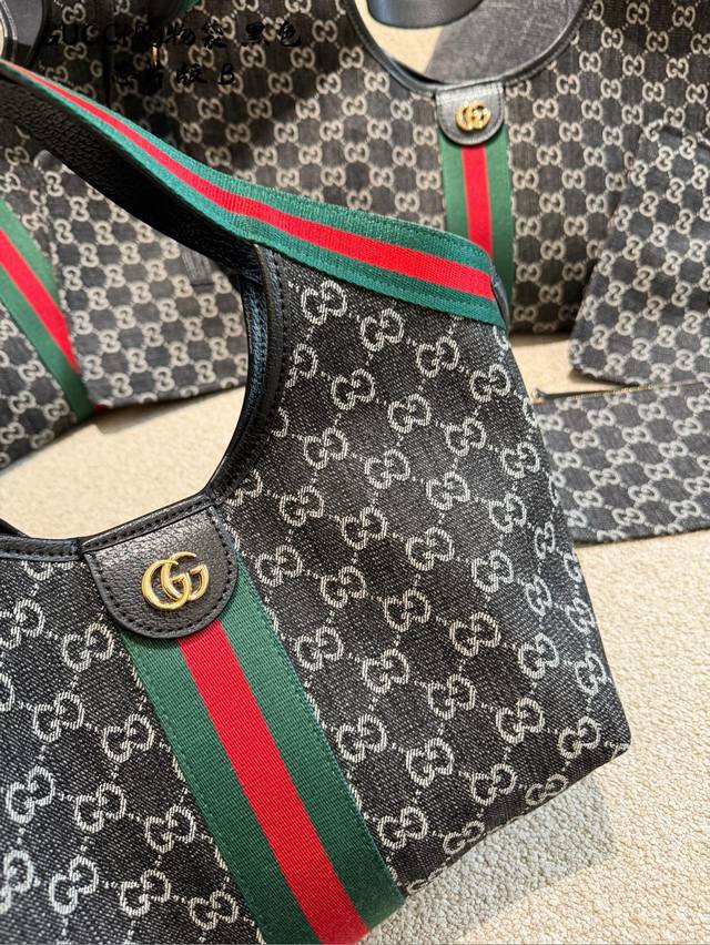 Leather-trimmed Gucci Giglio Gg Denim Tote Bag. This Gucci Giglio Gg denim tote bag features dark denim canvas with the classic Gg monogram, accented with red and green webbing for a retro yet stylish look. The small size offers moderate capacity, suitable for both commuting and casual occasions. Sizes: Large: 60 x 47 x 16 cm; Medium: 40 cm; Small: 25 cm.