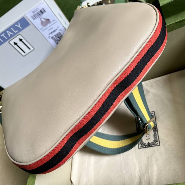 Gggucci Attache Large Shoulder Bag. Gucci's March of Love collection reinterprets the brand's heritage, paying homage to the enduring glamour of Hollywood. This accessory features a recognizable crescent moon shape, and the G hook closure adds a unique design aesthetic. Classic accessories combined with soft materials create a delicate and romantic interpretation of vintage charm. This large shoulder bag is crafted from beige and khaki Gg Supreme canvas with red and blue Web piping. Beige and khaki Gg Supreme canvas with red and blue Web piping, cotton and linen lining, and a leather shoulder strap. Interior: 1 zippered pocket, detachable Web shoulder strap with 50cm high G hook closure and zipper.