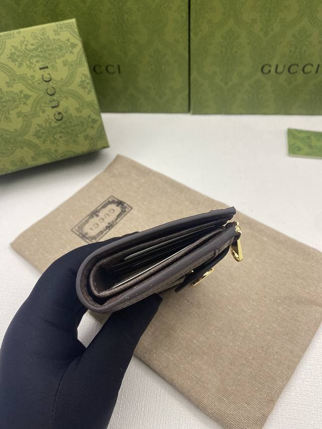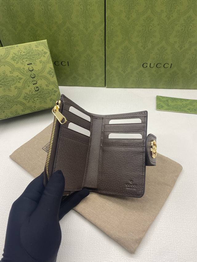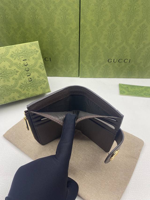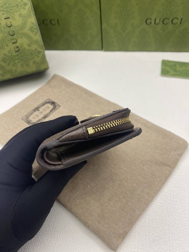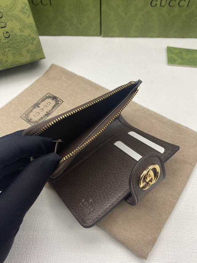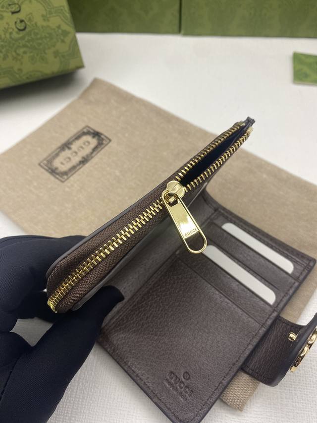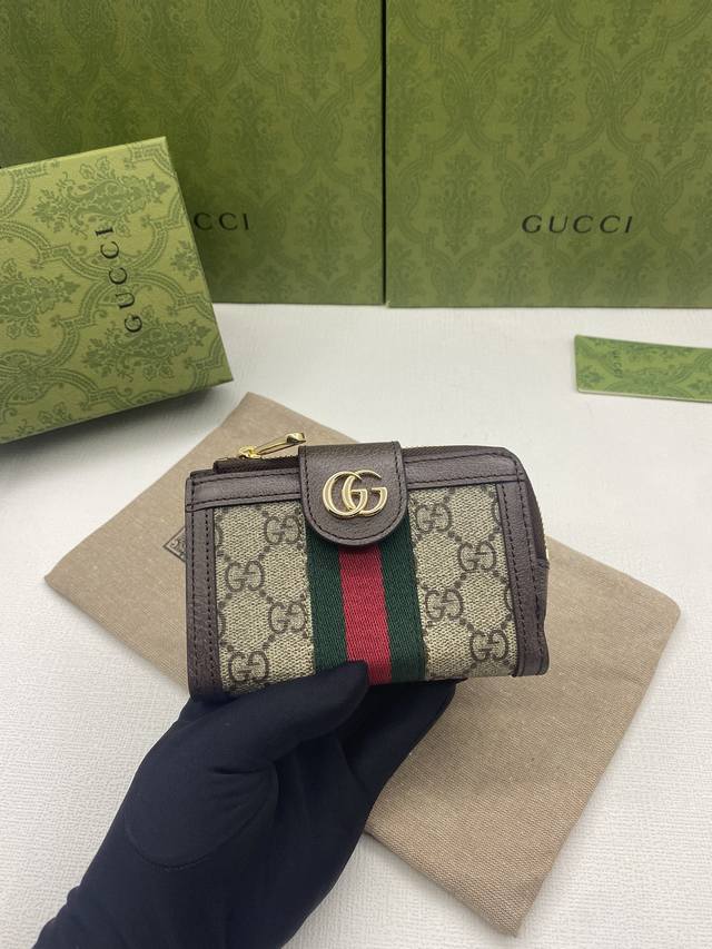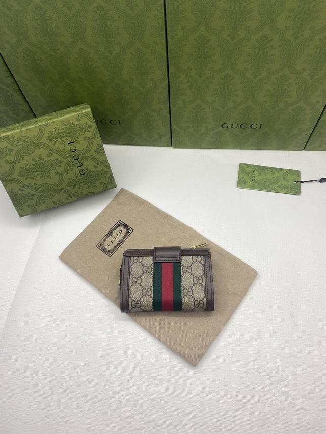 Ophidia series Gg full-zip wallet with green box packaging. The Gg logo, first used in the 1970s, evolved from the early Gucci diamond quilting that originated in the 1930s. This full-zip wallet combines the iconic pattern with striped webbing, a classic combination that pays homage to the origins of the Gucci brand. Beige ebony Gg Supreme canvas with brown leather trim, red and green webbing, gold-tone hardware with double Gs, zippered coin pocket, and full-zip closure. Model: 725662. Dimensions: 13cm (W) x 8.5cm (H) x 2cm (D). Color: Brown PVC.