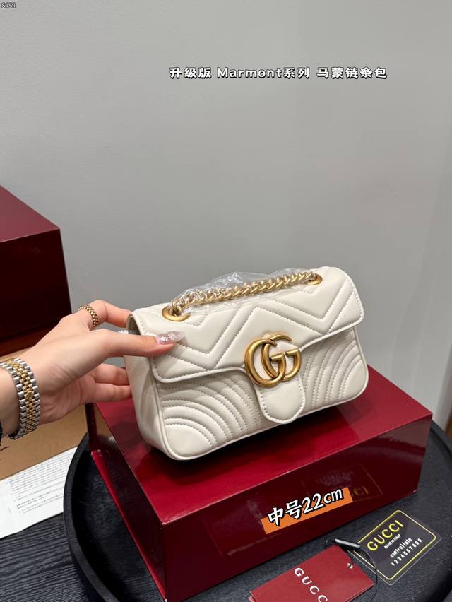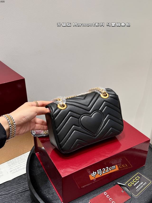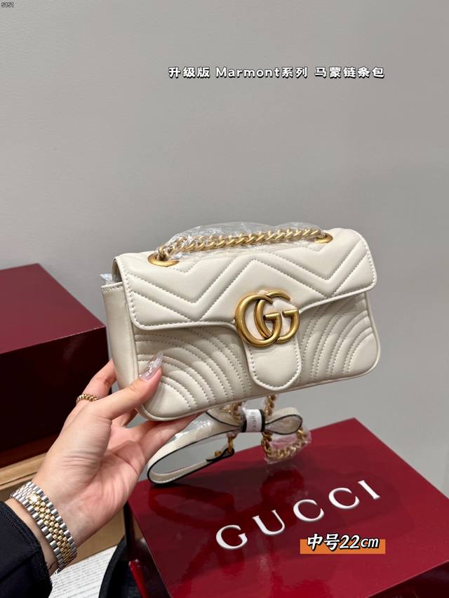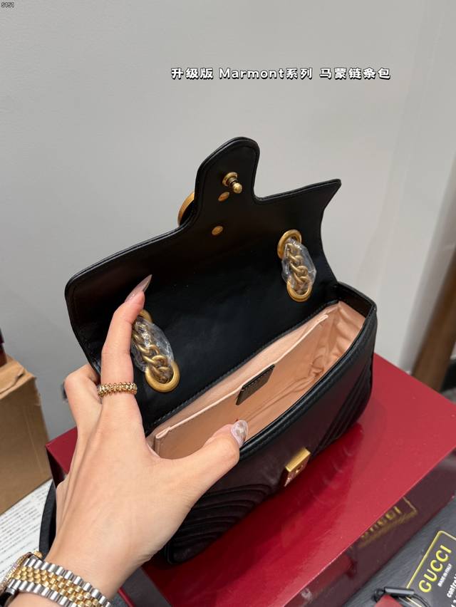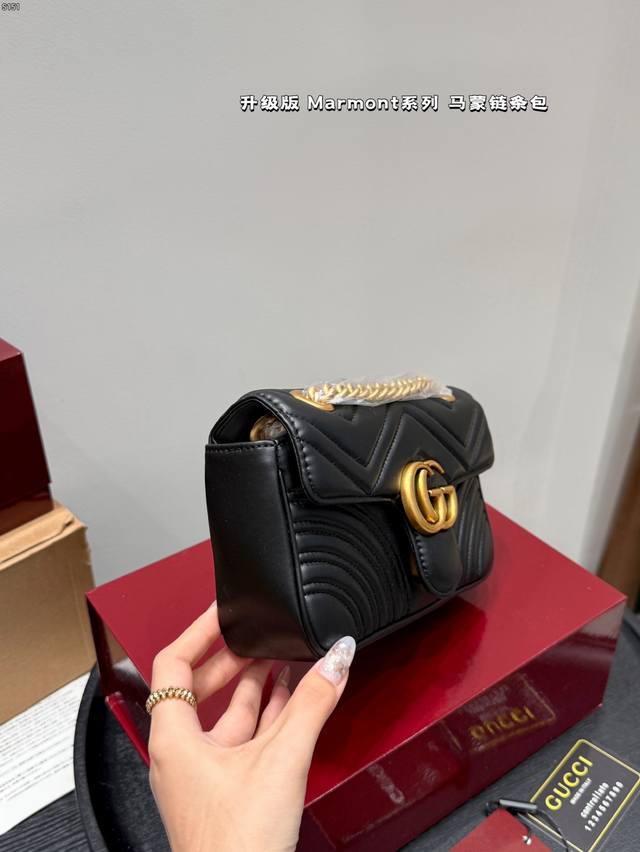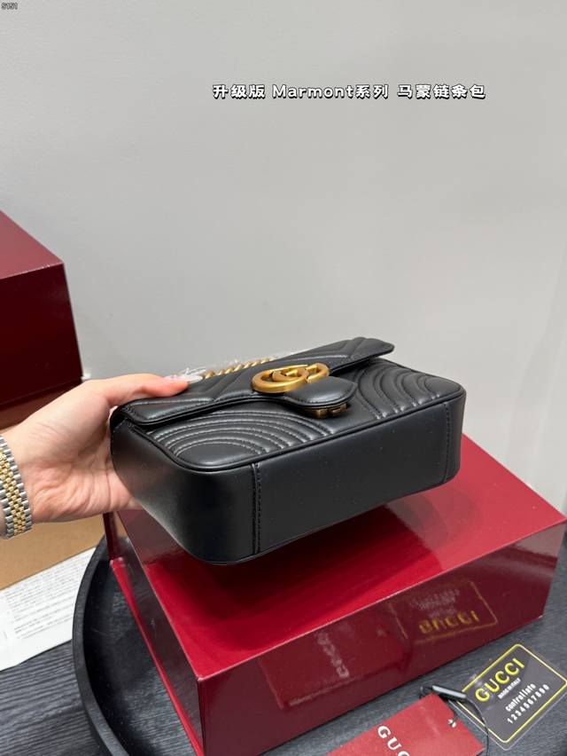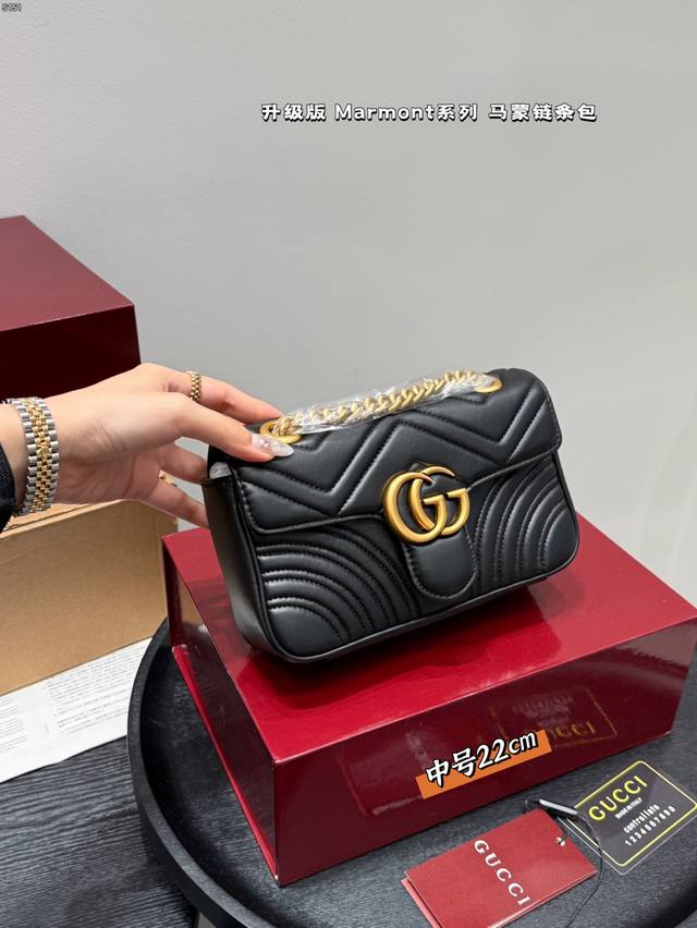 The Gucci Marmont chain shoulder bag features a soft, structured shape and an oversized flap closure, accented with Double G hardware. The sliding chain shoulder strap allows for versatile carry, switching between shoulder and hand carry. Crafted from wavy quilted leather, with the Gg logo on the back. A bestseller