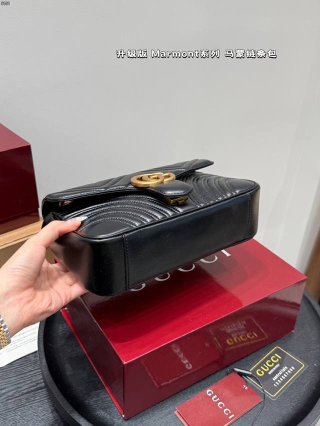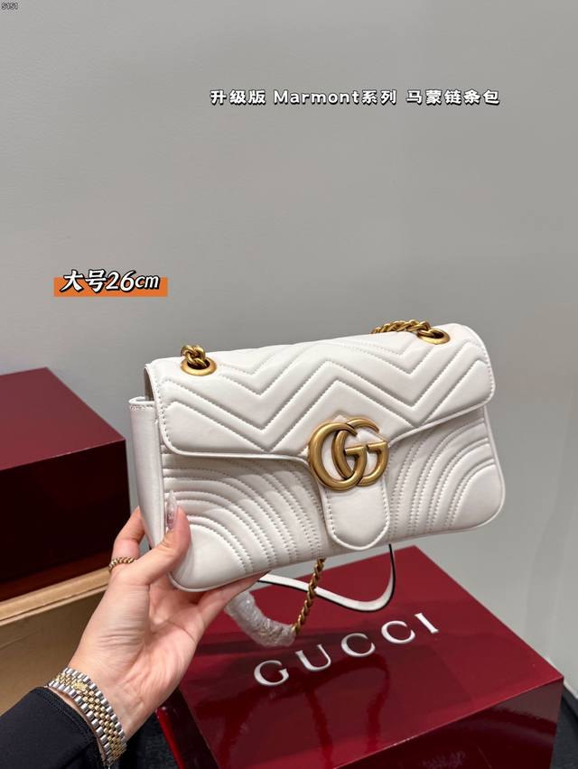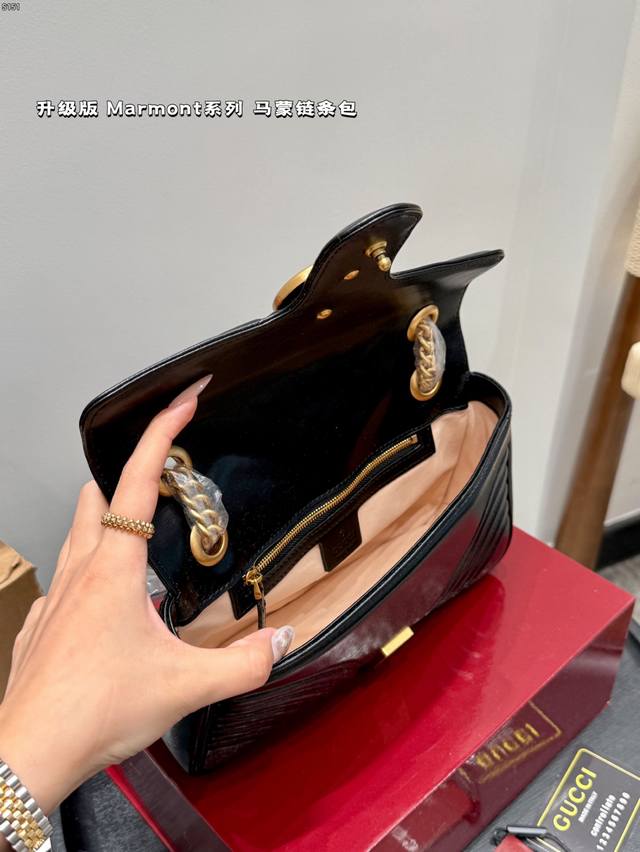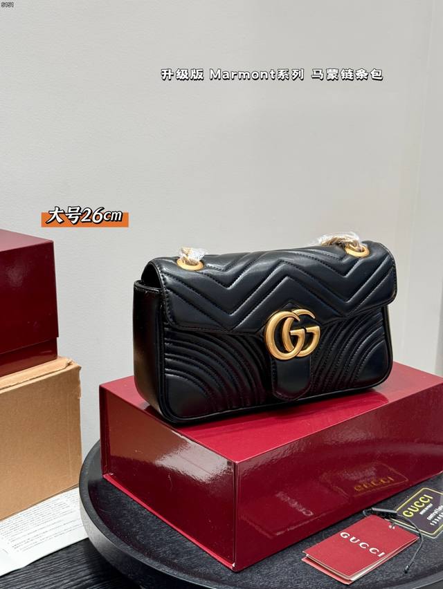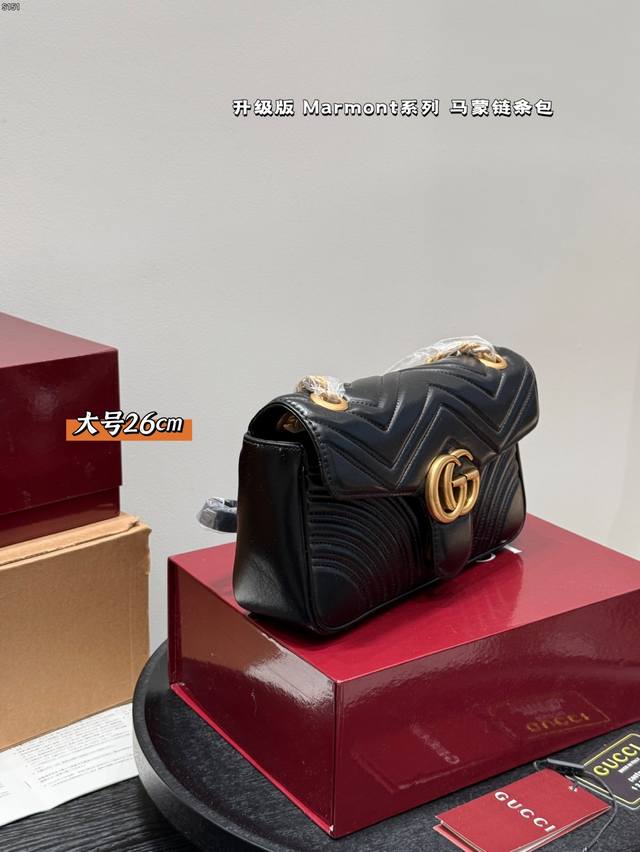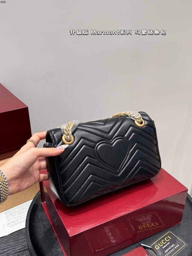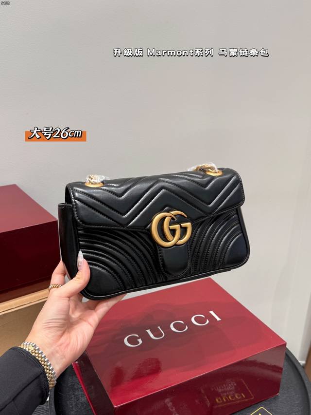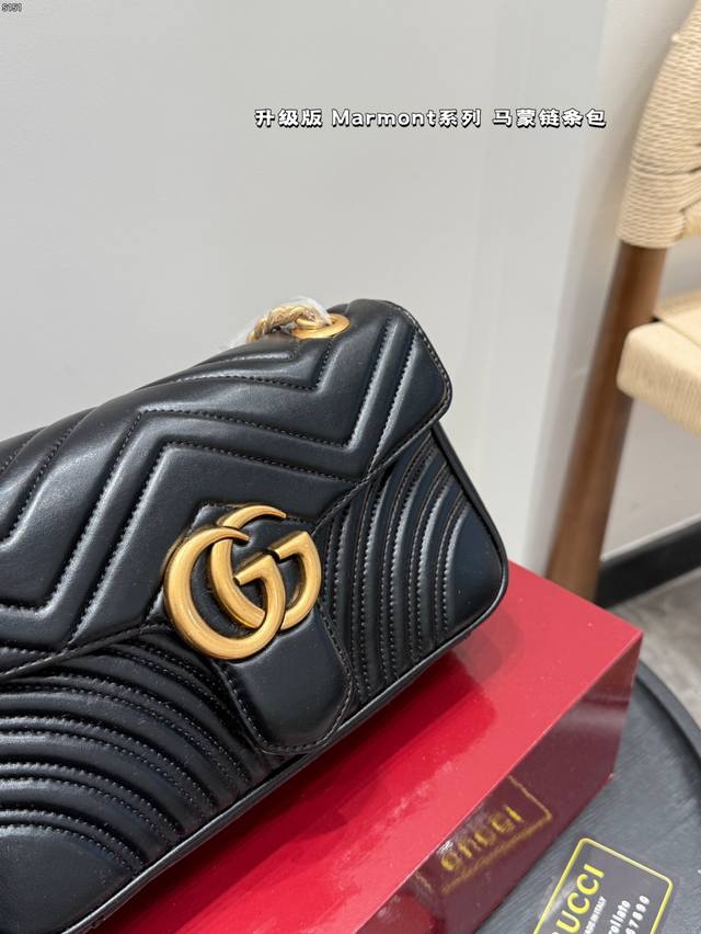 The Gucci Marmont chain shoulder bag features a soft, structured shape and an oversized flap closure with Double G hardware. The sliding chain shoulder strap allows for versatile carry, switching between shoulder and hand carry. Crafted from wavy quilted leather with the Gg logo on the back. A bestseller