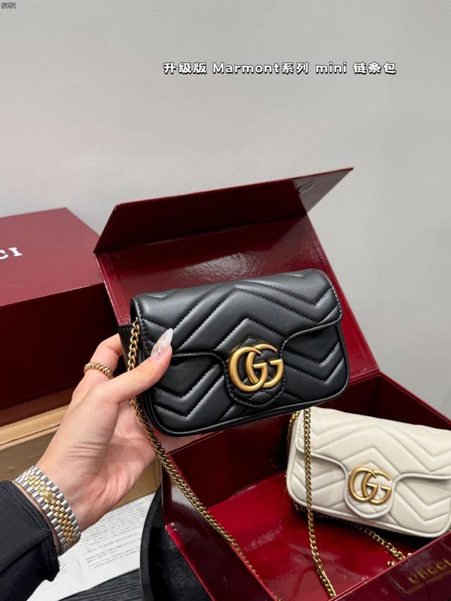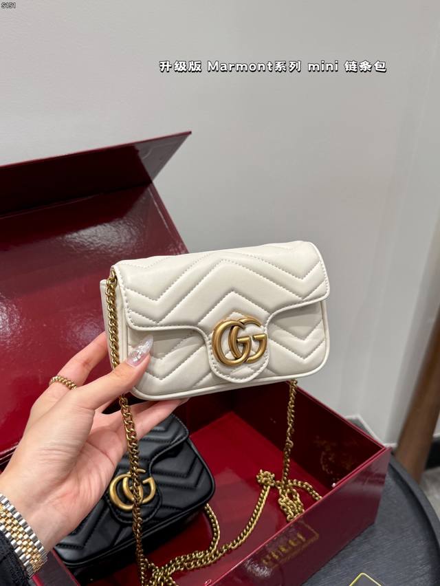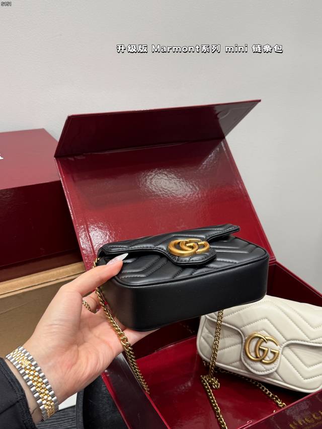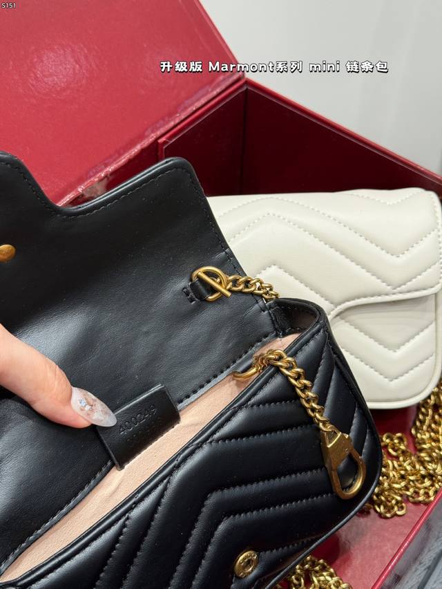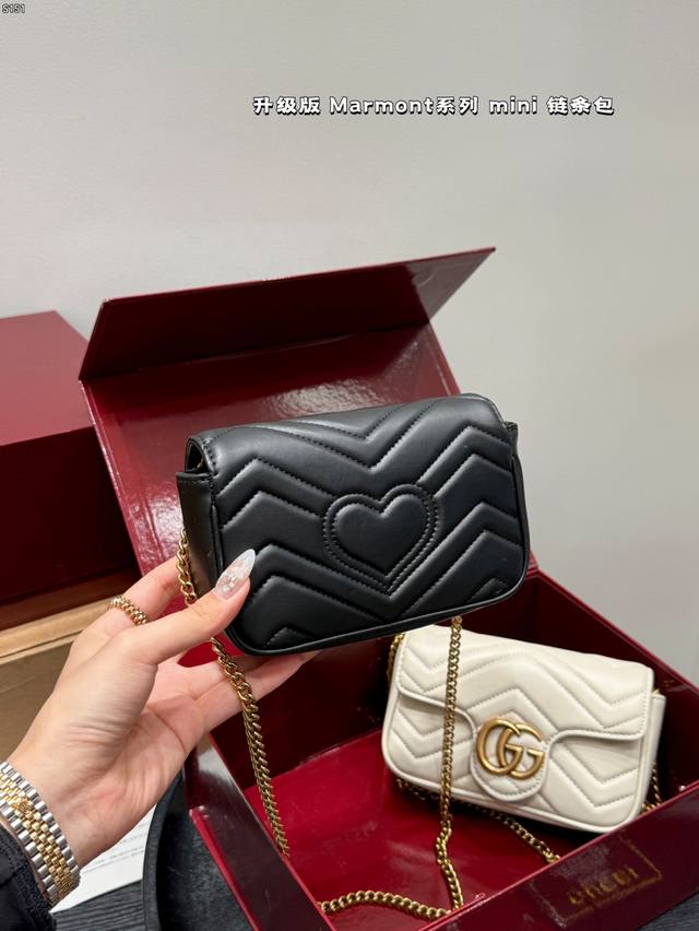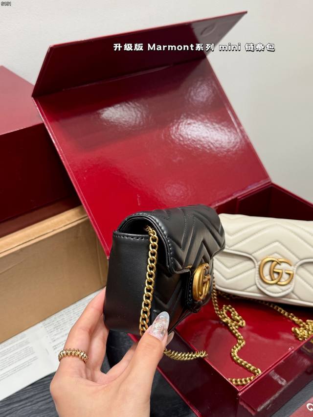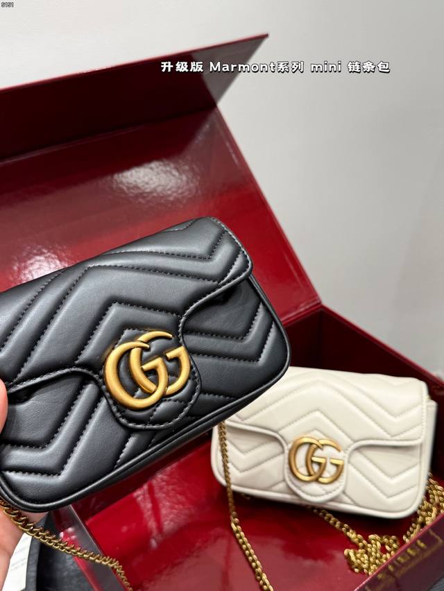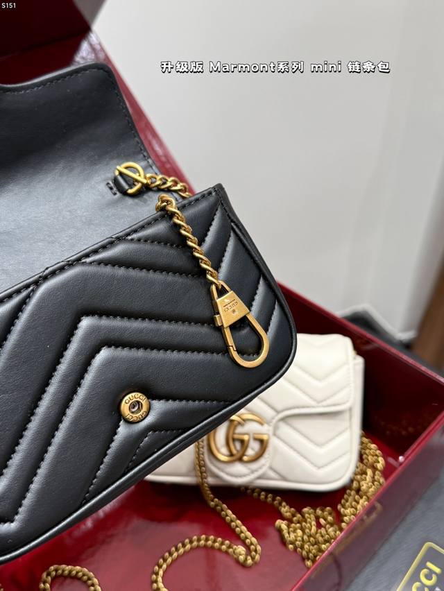 The Gucci Marmont chain shoulder bag features a soft, structured shape and an oversized flap closure with Double G hardware. The sliding chain shoulder strap allows for versatile carry, switching between shoulder and hand carry. Crafted from wavy quilted leather with the GG logo on the back. A bestseller at the Gucci Marmont. Size: Mini 16 8cm