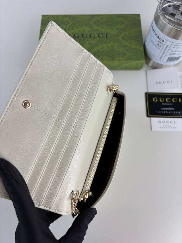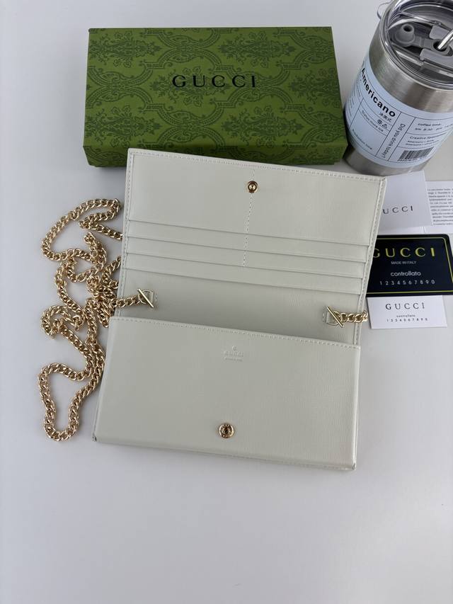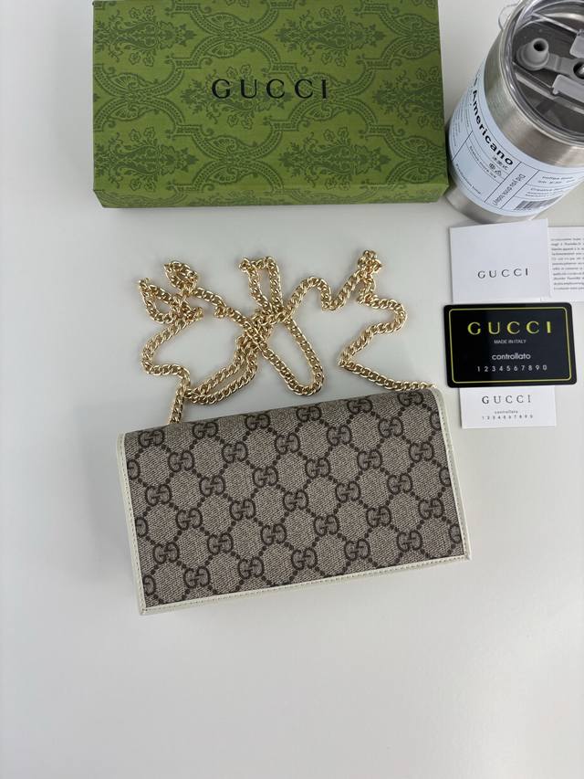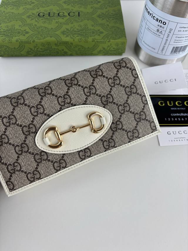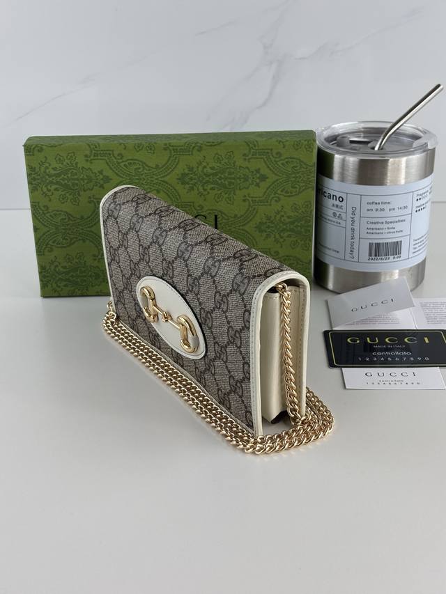 Gucci introduces its new 1955 Horsebit cardholder, crafted from Gg Supreme canvas and brown leather. This design features the signature double-ring and elongated shape, a detail inspired by the brand's equestrian heritage and one of Gucci's most iconic symbols. Style number: 621892 Dimensions: 19cm x 10cm x 3cm Color: White