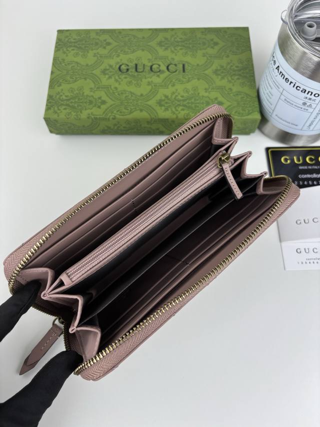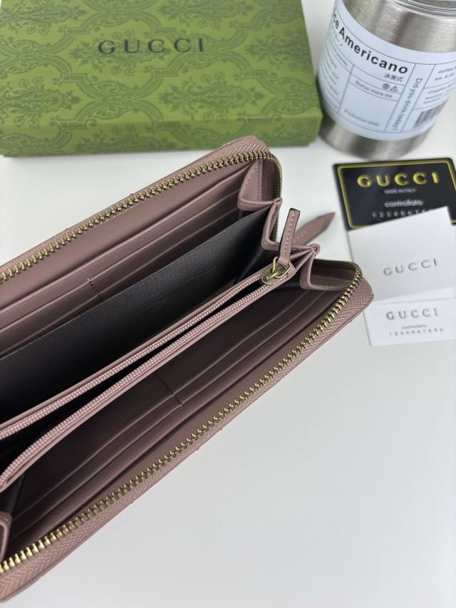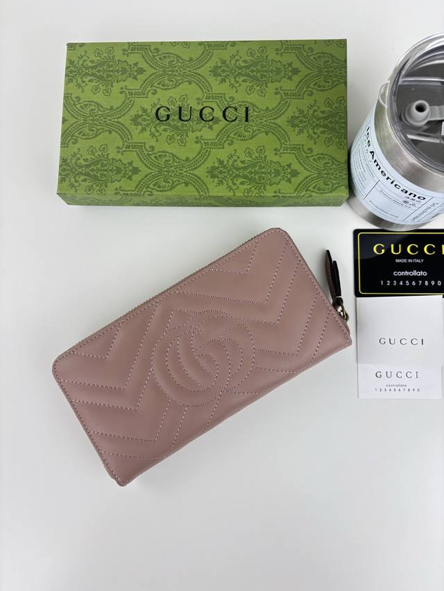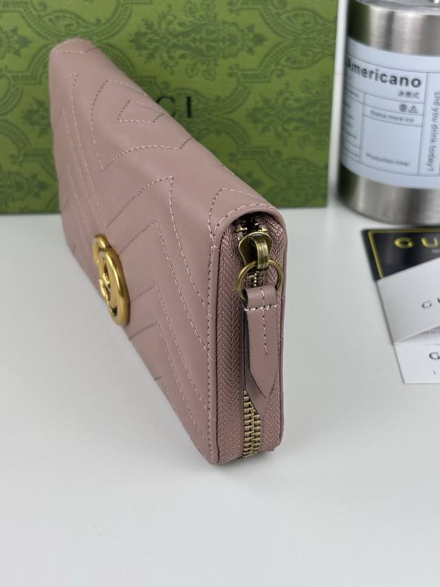 Guccl Gg Marmont Long Zip Wallet. Features a quilted design, embroidered Gg logo on the back, vintage gold-tone hardware, Italian-made double G snap closure, 12 card slots, 3 bill slots, and a separate internal zip coin pocket. Model: 443123. Dimensions: 19cm x 10cm x 2.5cm. Color: Pink.