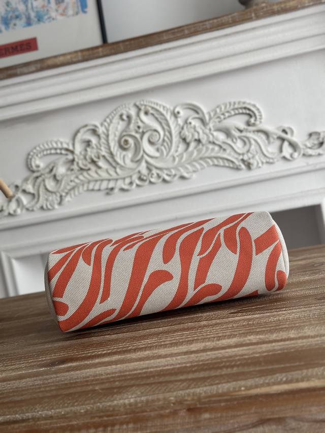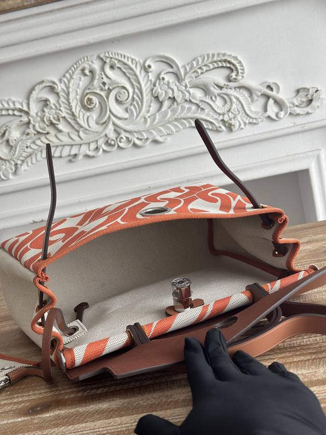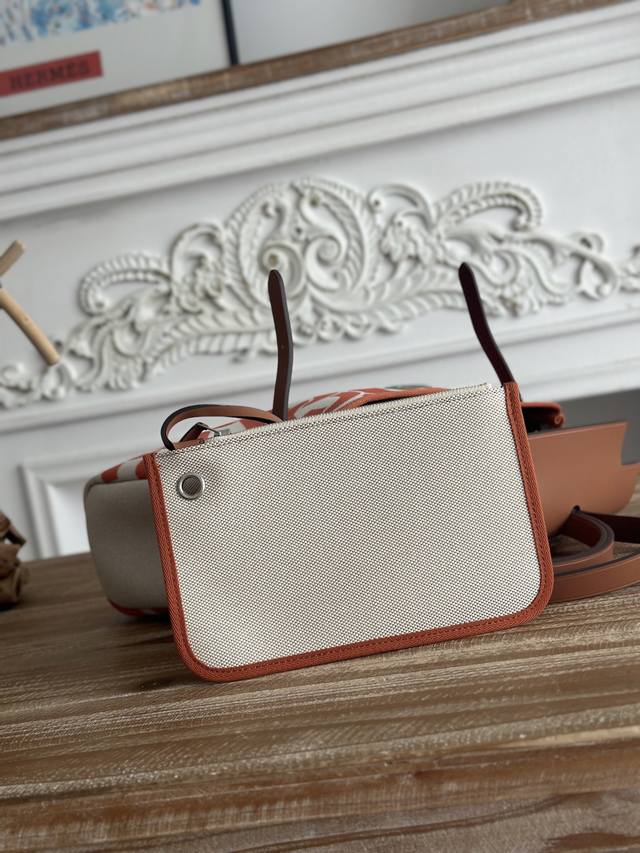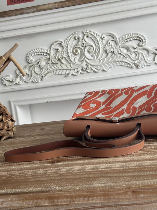 is inspired by saddlebags. The bag body is made of canvas, with leather interior stitching, shoulder strap, and handles. It resembles the Kelly bag in shape, but is much lighter!