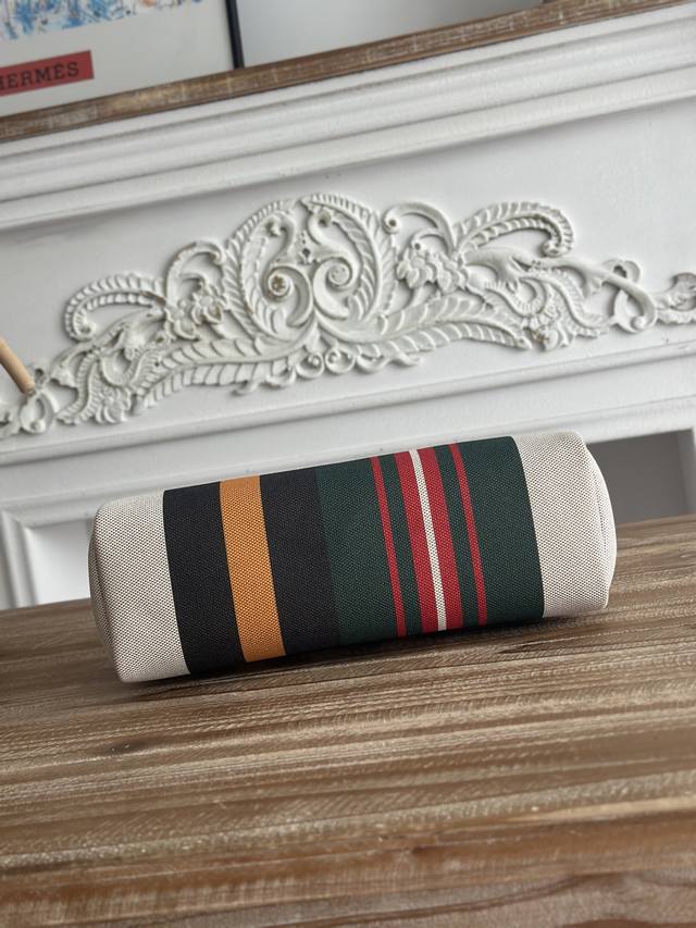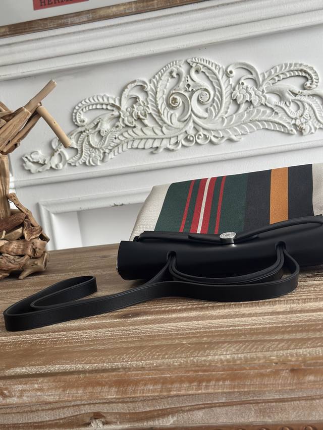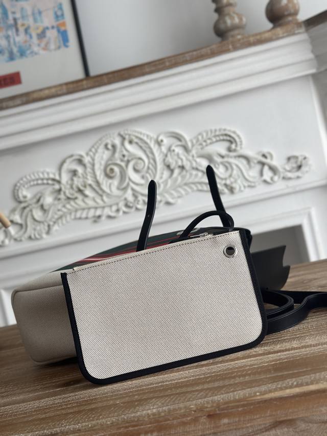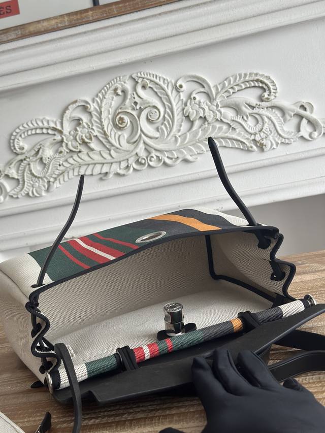 is inspired by saddlebags. The bag body is made of canvas, with leather interior stitching, shoulder strap, and handles. It resembles the Kelly bag in shape, but is much lighter!