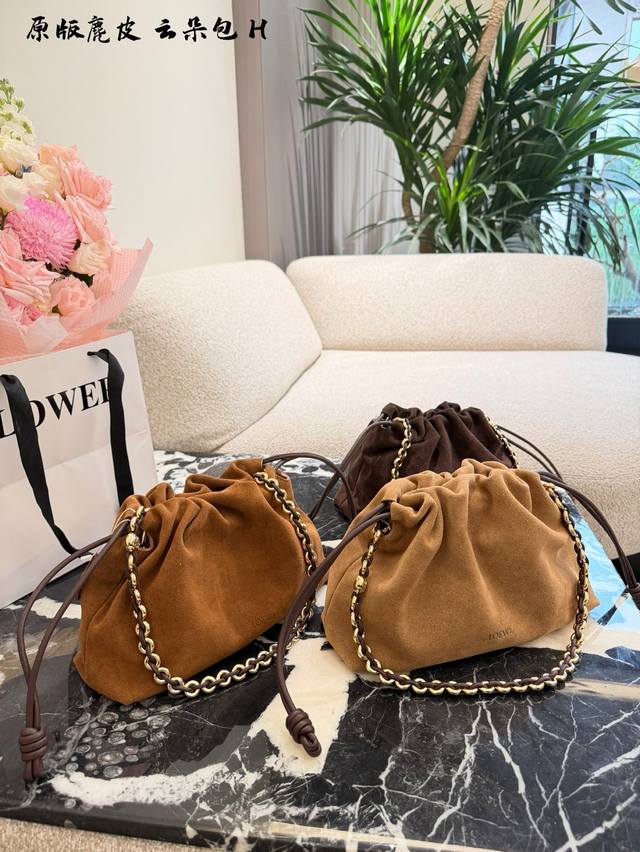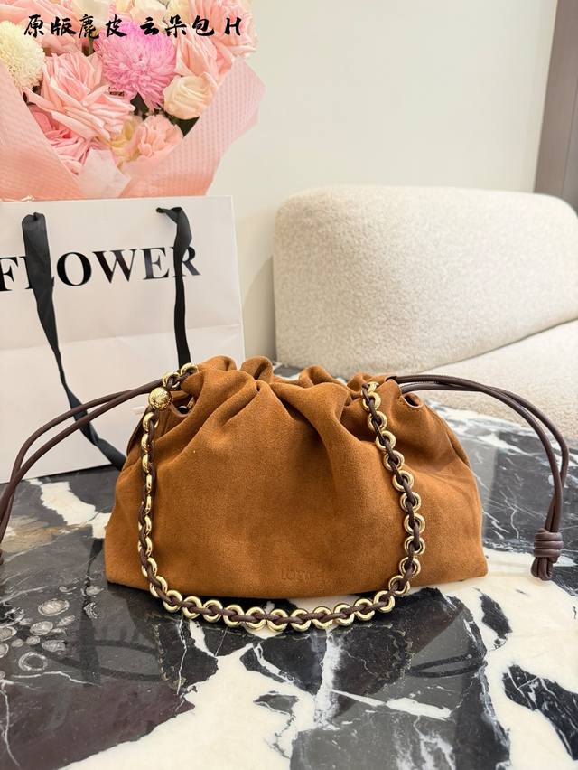 Loewe Flamenco Lucky Bag. Made of Nappa lambskin and suede, this Loewe Flamenco lucky bag is incredibly soft to the touch. It features the iconic donut chain and an adjustable shoulder strap, making it suitable for both hand-carrying and shoulder-carrying. The caramel brown color is very sophisticated, and the moderate capacity makes it suitable for both work and leisure. Inspired by Spanish dance steps, the Flamenco series is elegant and artistic, a classic Loewe design, and extremely popular in the fashion world. Celebrities and bloggers are all carrying it. 26cm (no box).