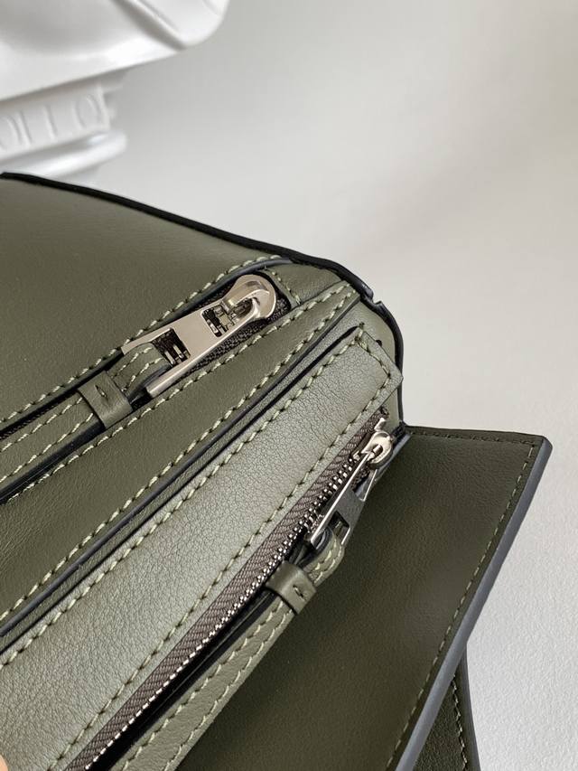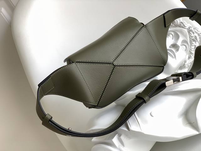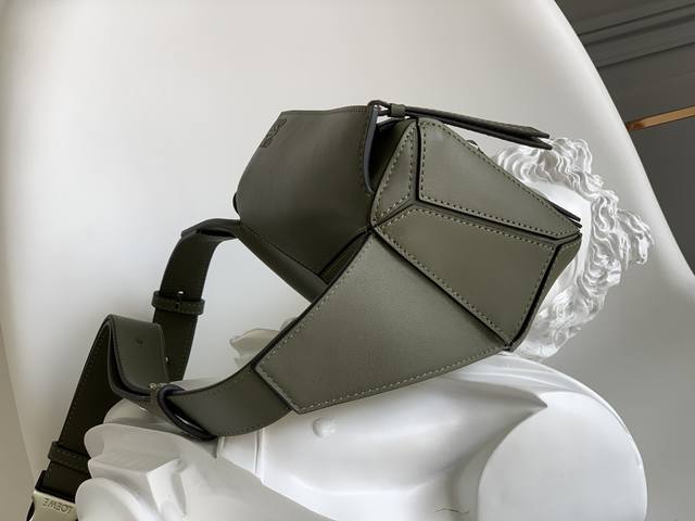The cowhide puzzle handbag is the debut handbag launched by creative director Jonathananderson for Loewe *The rectangular shape and precise cutting technology create the unique geometric lines of the puzzle *Now launched a small waist bag *Carry at the waist *Shoulder or crossbody *Adjustable shoulder strap *Metal buckle closure engraved with the Loewe logo *One internal slip pocket and one external zipper pocket *Cowhide zipper pull *Herringbone cotton canvas lining Anagram embossed