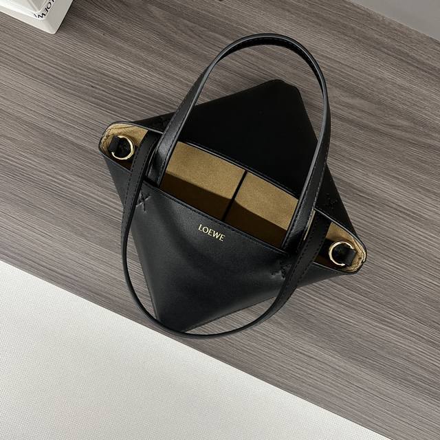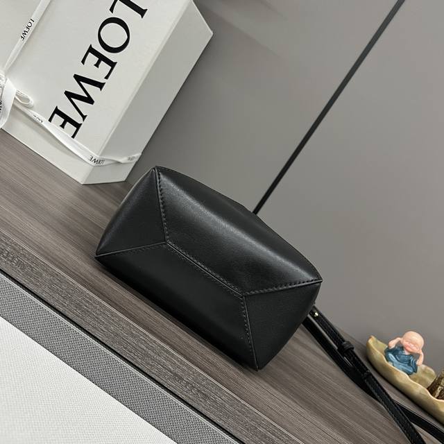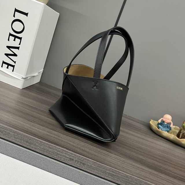 The new Loewe mini Puzzle Fold handbag in glossy calfskin draws inspiration from the geometric lines of the brand's classic handbag collection, reinterpreted with geometrically architectural panels. It folds completely, making it a perfect travel companion. The brand has cleverly crafted a soft and lightweight handbag, adorned with the understated elegance of the Loewe logo. This mini version is made of glossy calfskin and can be carried on the shoulder, crossbody, or by hand. It features a detachable and adjustable shoulder strap, suede lining, and Lw gold foil stamping. Size: 16.5*9.5*20cm. Model: 052322.