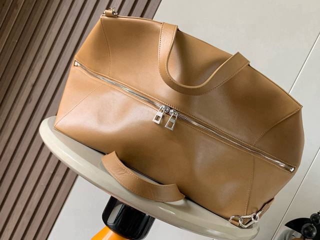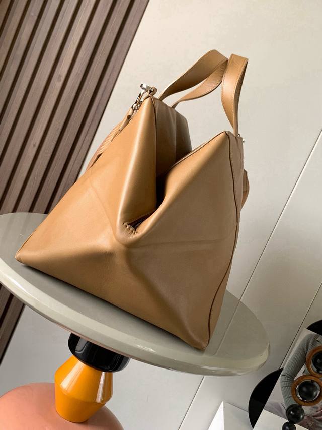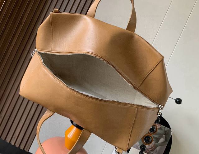 The new oversized shiny calfskin puzzle fold bag draws inspiration from the geometric lines of the brand's classic handbags, reinterpreting them with panels imbued with architectural aesthetics. It's fully foldable, making it a perfect travel companion. The brand's creative ingenuity creates a soft and lightweight bag, accented by the understated elegance of the Loewe logo. This oversized version is crafted from shiny calfskin. *Can be carried on the shoulder or by the hand*Suede lining*Loewe gold stamping