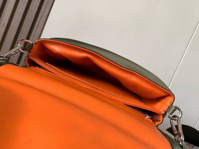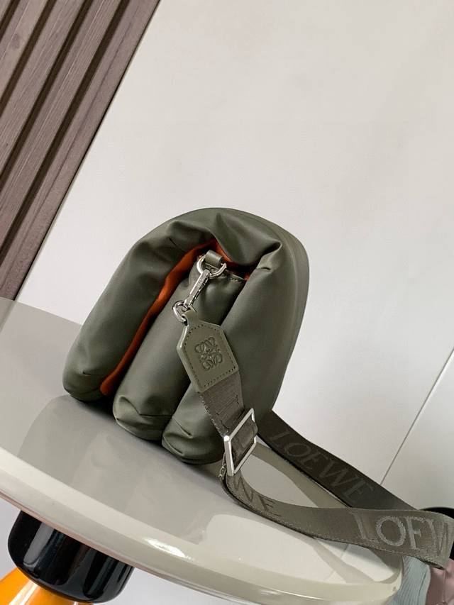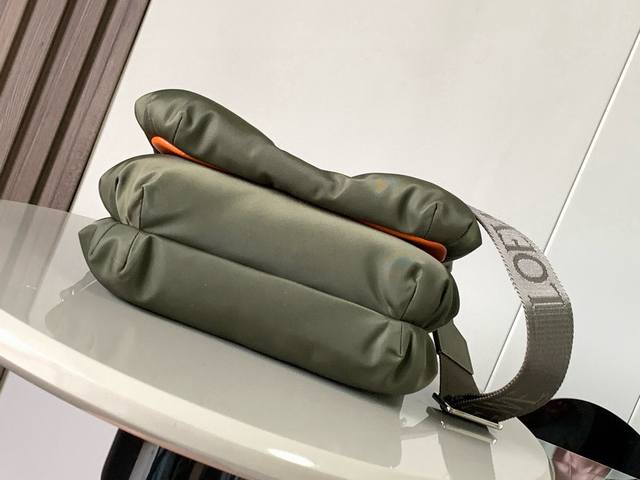 Medium Nylon Puffer Goya Messenger Bag. Inspired by Goya's aesthetic and key details, the Goya Puffer brings a new sensory and tactile dimension with its goose feather lining. This messenger bag is made of nylon and paired with a LOEWE webbing shoulder strap. The soft, lightweight, and fluffy texture of the bag, lined with sheepskin, gives it a bread-like feel. This new Goya messenger bag is truly amazing! Nylon fabric is really a good accessory. Whether it is the color, the texture of the fabric, or the fluidity of the entire design line, it has touched my heart. The outer layer is made of nylon, which feels soft and sticky like a pillow. It is filled with super fluffy goose down and lined with Nappa sheepskin. The wide shoulder straps embroidered with Yu Mu make the whole shape more casual and chubby. The bag is very light and there is no sense of weight on the upper body. The whole feeling is very casual. The capacity is no problem for daily going out. It feels like a small bun, fluffy and cute. The wide shoulder straps do not squeeze the shoulders and can be adjusted at will. It is perfect for taking pictures when going out.