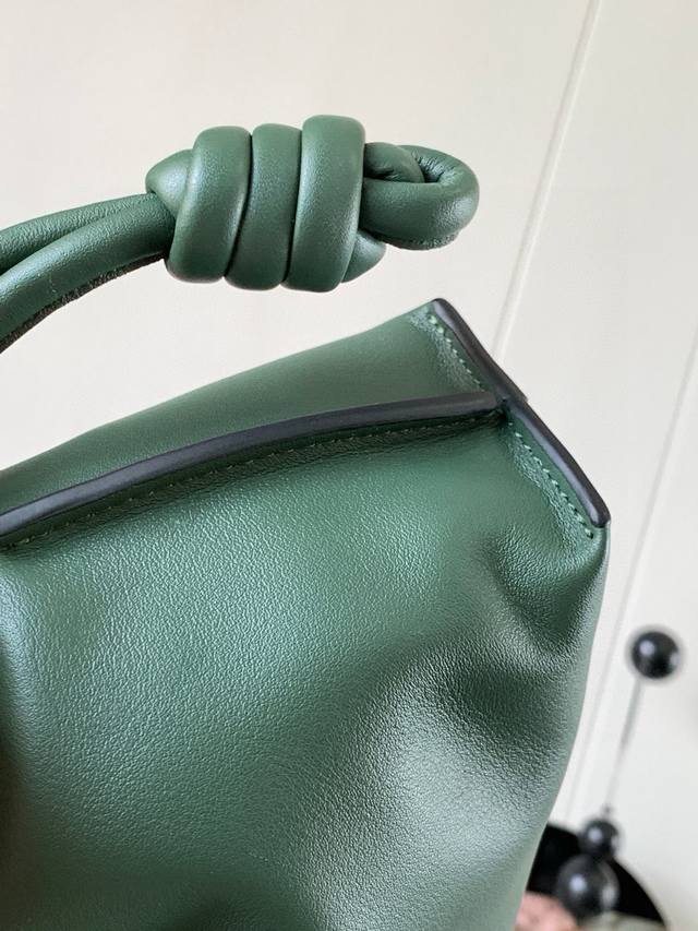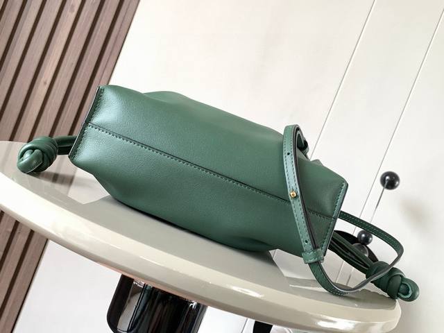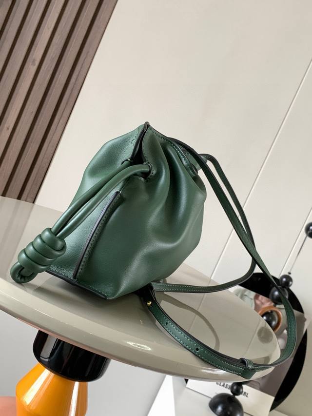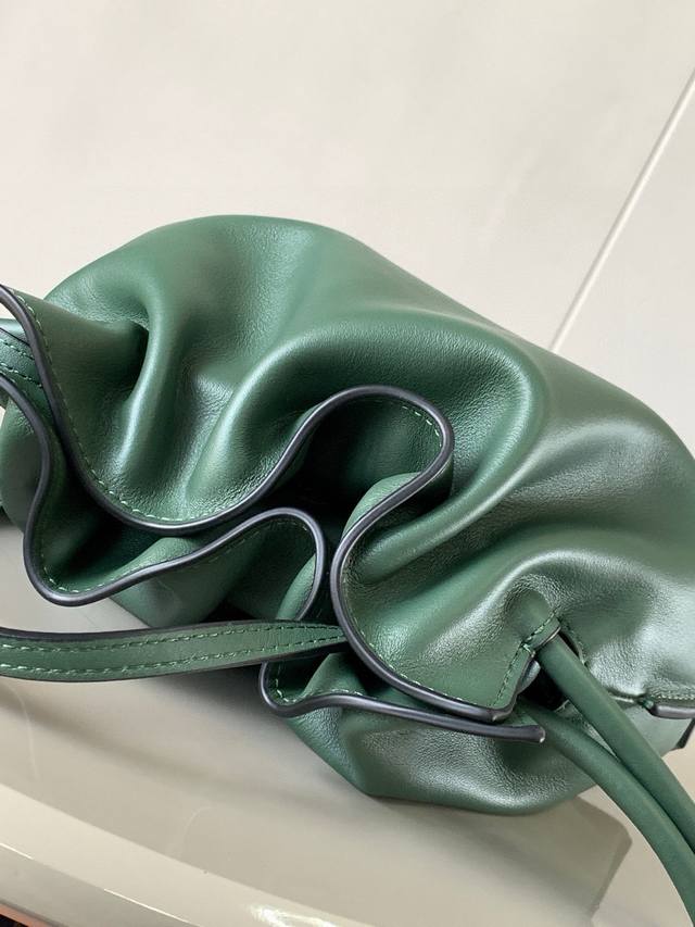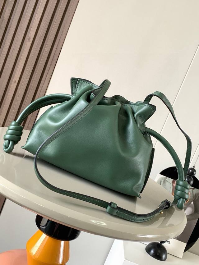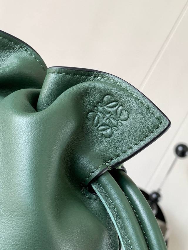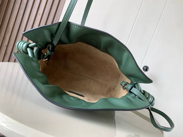 National Day Special Offer Mini 23cm New Nappa Calf Leather Flamenco Handbag. This lucky bag features a drawstring closure and a signature coiled knot. Made from Nappa calf leather, this version perfectly showcases the softness and practicality of leather in the Flamenco Knot. It's safe to say that whatever you're looking for, you can find it in the Flamenco Knot. It perfectly combines the drawstring bag and tote bag, giving women a unique feel. While it looks incredibly simple, it's also very special, exuding a casual yet stylish vibe. The bag's name is the same as the flamenco dance of the Spanish Gypsies, which perfectly represents Loewe's casual, elegant, and individualistic design style. The leather is smooth Spanish calfskin, exceptionally soft to the touch, with a sturdy and scratch-resistant suede lining. Highly visible in street style photos, it can be used as a shoulder bag or a tote bag. The distinctive drawstring design and soft leather construction, when tightened, create a smoother silhouette, making it suitable for both work and leisure. Size: 23cm~18cm~9cm Style Number: 9036 Color: Vintage Green