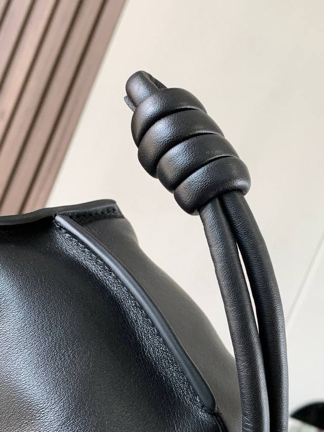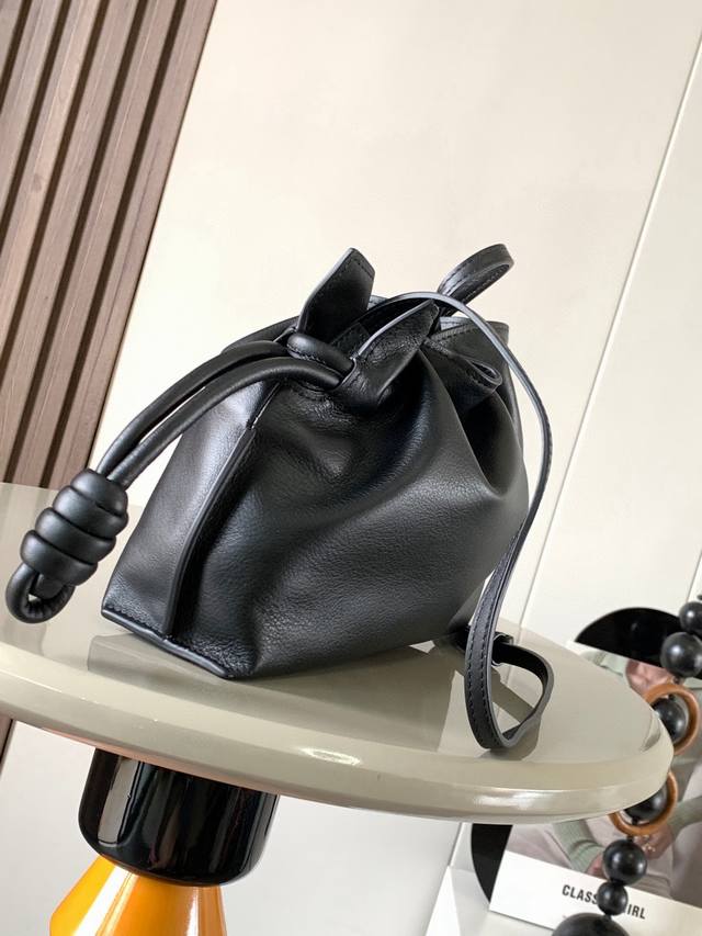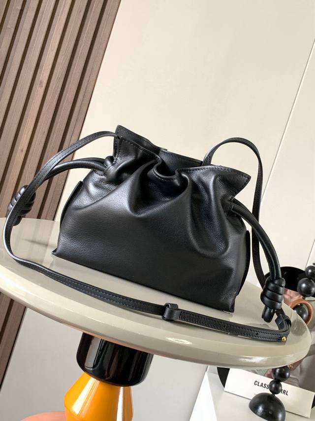 National Day Special Offer Mini 23cm New Nappa Calf Leather Flamenco Handbag. This lucky bag features a drawstring closure and a signature coiled knot. Made from Nappa calf leather, this version perfectly showcases the softness of leather and practicality in the Flamenco Knot. It's safe to say that whatever you want to look for, you can find it in the Flamenco Knot. It perfectly combines the drawstring bag and tote bag, giving women a unique feel. Although it looks incredibly simple, it's also very special, exuding a casual yet stylish vibe. The bag's name is the same as the flamenco dance of the Spanish Gypsies, which perfectly represents Loewe's casual, elegant, and individualistic design style. The leather is smooth Spanish calfskin, with a particularly soft feel. The suede leather lining is sturdy and scratch-resistant. Highly featured in street style photos, it can be used as a shoulder bag or a tote bag. The distinctive drawstring design and soft leather construction, when tightened, create a smoother silhouette, making it suitable for both work and leisure. Size: 23cm~18cm~9cm Style Number: 9036 Color: Black