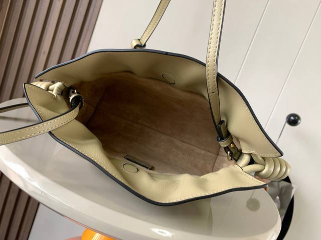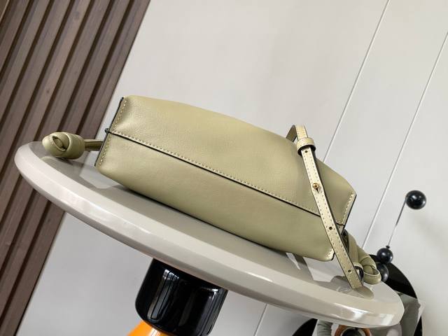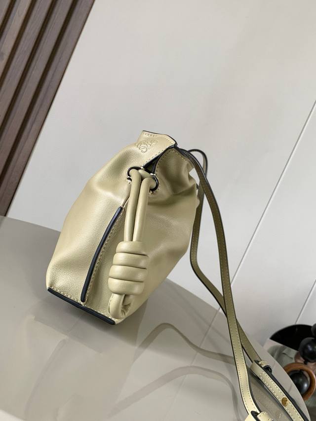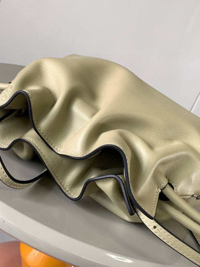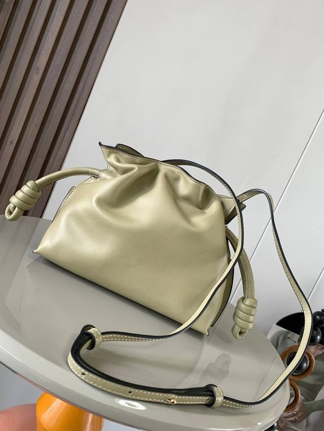 National Day Special Offer Mini 23cm New Nappa Calf Leather Flamenco Handbag. This lucky bag features a drawstring closure and a signature coiled knot. Made from Nappa calf leather, this version perfectly showcases the softness of leather and practicality in the Flamenco Knot. It's safe to say that whatever you want to look for, you can find it in the Flamenco Knot. It perfectly combines a drawstring bag and a tote bag, giving women a unique feel. Although it looks incredibly simple , it's also very special, exuding a casual yet stylish vibe. The bag's name is the same as the flamenco dance of the Spanish Gypsies, which perfectly represents Loewe's casual, elegant, and individualistic design style. The leather is smooth Spanish calfskin, with a particularly soft feel. The suede leather lining is sturdy and scratch-resistant. Highly featured in street style photos, it can be used as a shoulder bag or a tote bag. The distinctive drawstring design and soft leather construction, when tightened, create a smoother silhouette, making it suitable for both work and leisure. Size: 23cm~18cm~9cm Style Number: 9036 Color: Clay Green
