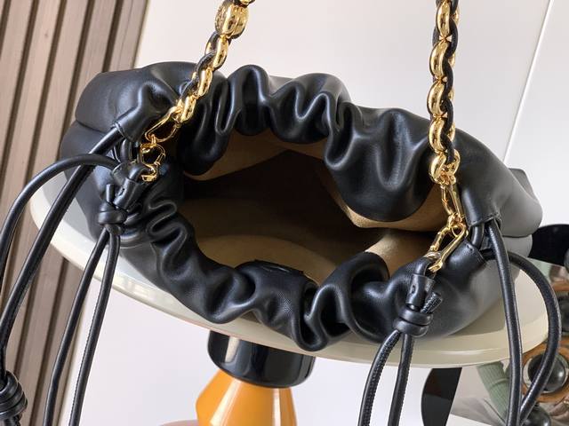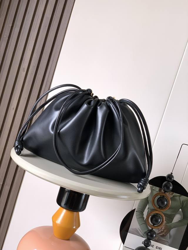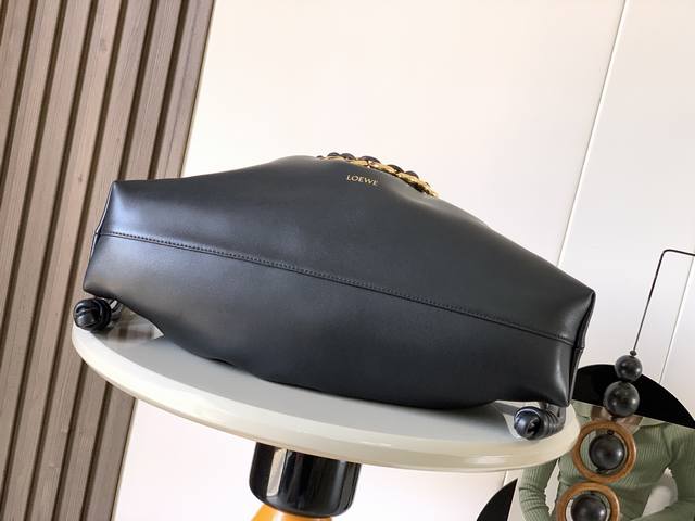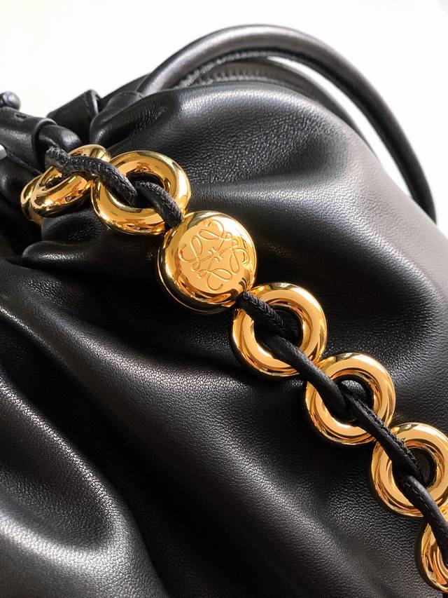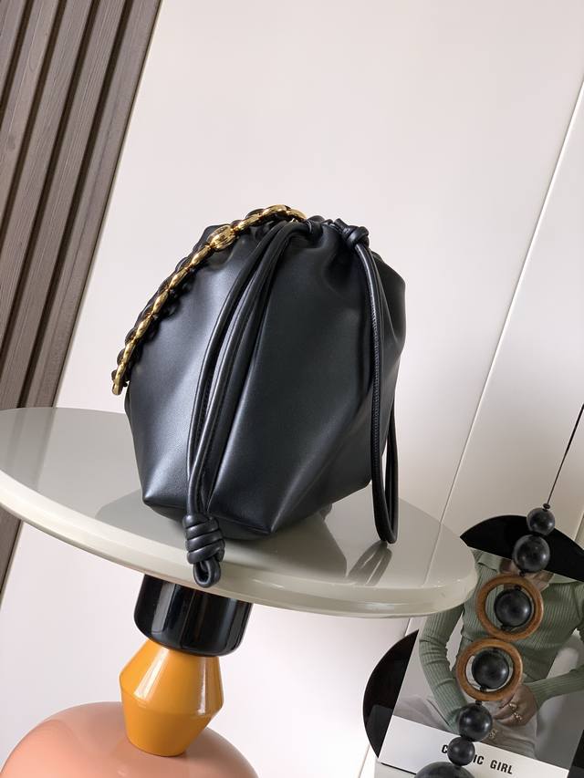New large deerskin Flamenco Purse clutch featuring a pleated design and signature knotted sides. This large version is crafted from deerskin. *Can be carried on the shoulder, crossbody, or by hand* *Detachable and adjustable leather shoulder strap* *Durable yet soft and shiny. *Detachable donut chain embellished with Anagram pebble* *Magnetic closure* *Suede lining* Loewe silver-stamped