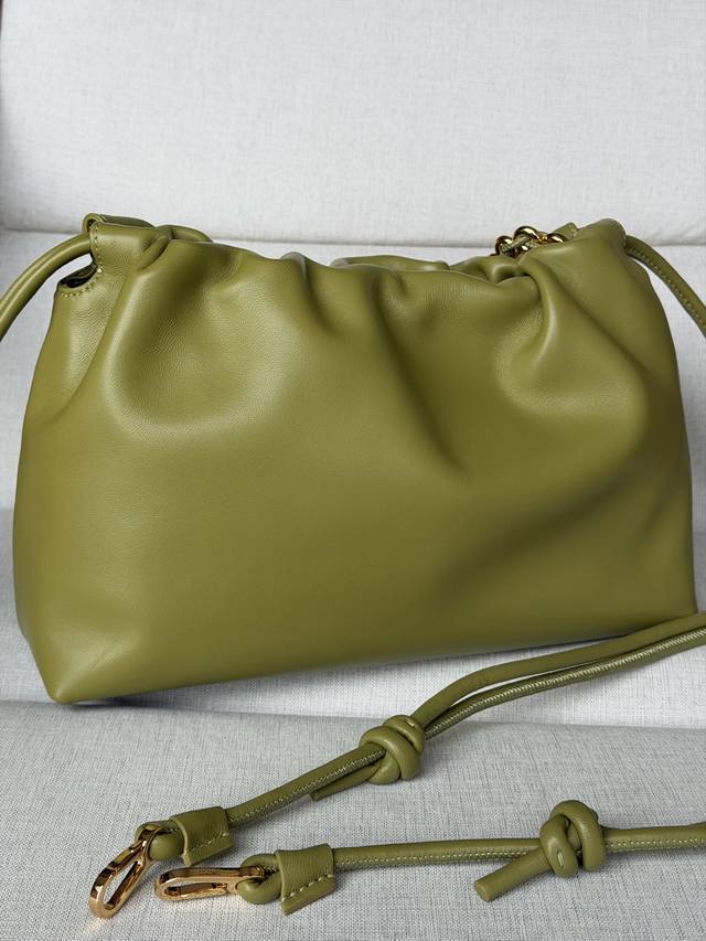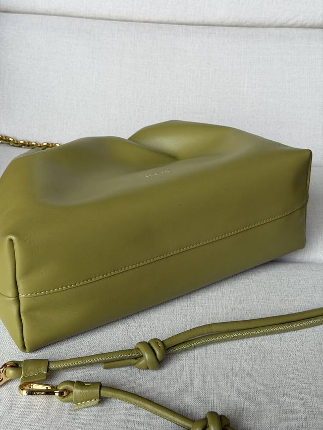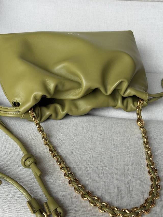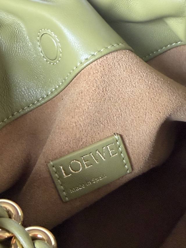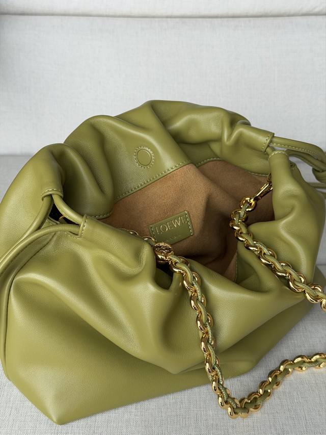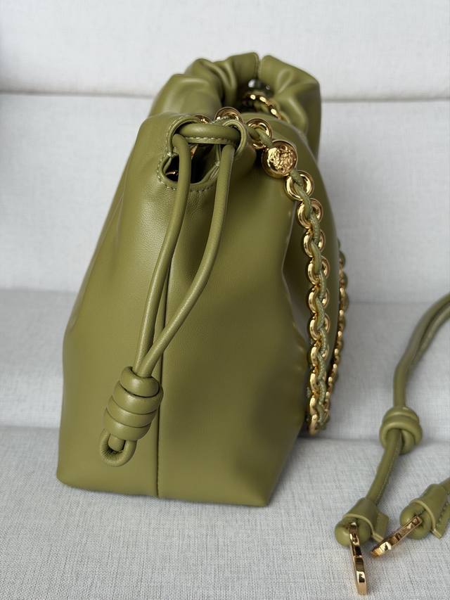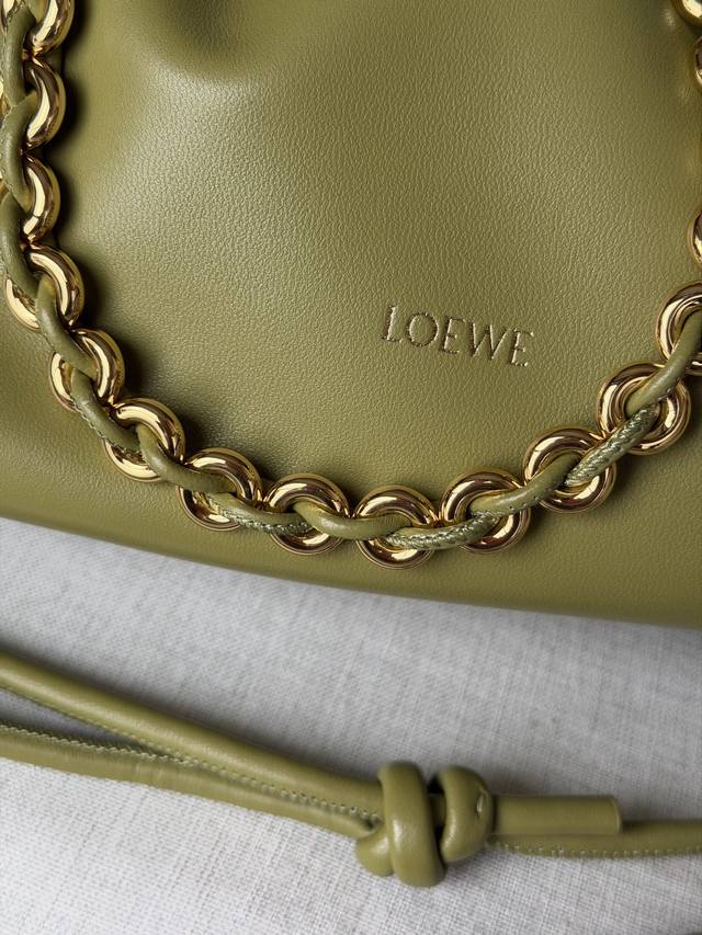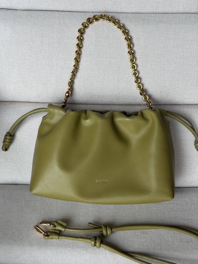 Original Leather DDD 1774 Matching Metal Chain + 1 Long Shoulder Strap DDD Light Moss Color DDD Soft Nappa Lamb Leather Flamenco Purse Clutch DDD Large 30-10.5-20 DDD The Flamenco Purse handbag features a pleated design and key details such as the signature rope knot on the side. Stylish and versatile, it can be carried as a clutch, over the shoulder with the donut chain, or crossbody with the leather shoulder strap. This version is made of soft Nappa lamb leather. DDD Can be carried on the shoulder, crossbody, or by hand DDD Detachable and Adjustable Leather Shoulder Strap DDD Detachable Donut Chain with Anagram Engraved Pebble Texture DDD Subtle Magnetic Closure DDD Suede Lining DDD Loewe Gold or Silver Stamping DDD